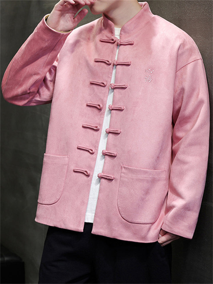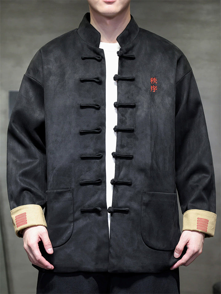 Men Chinese Style Stand Collar Loose Fit Jacket with Hanzi Embroidery