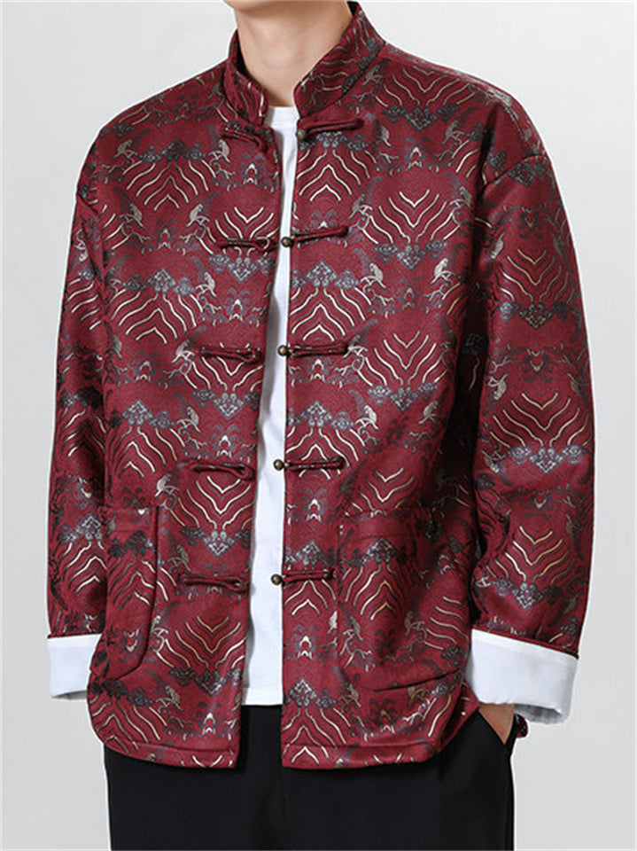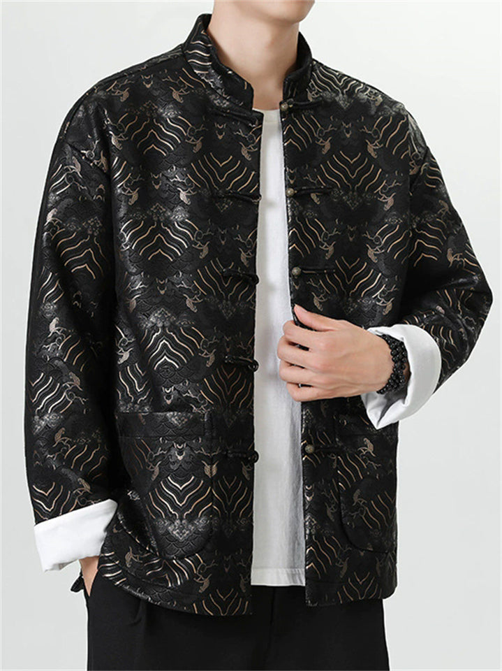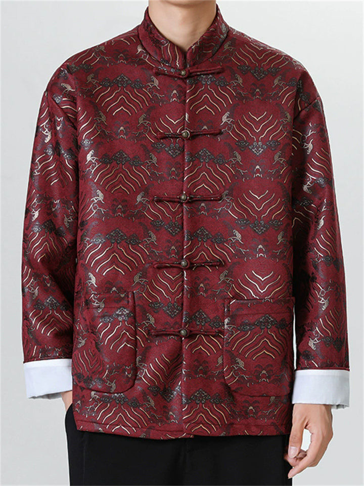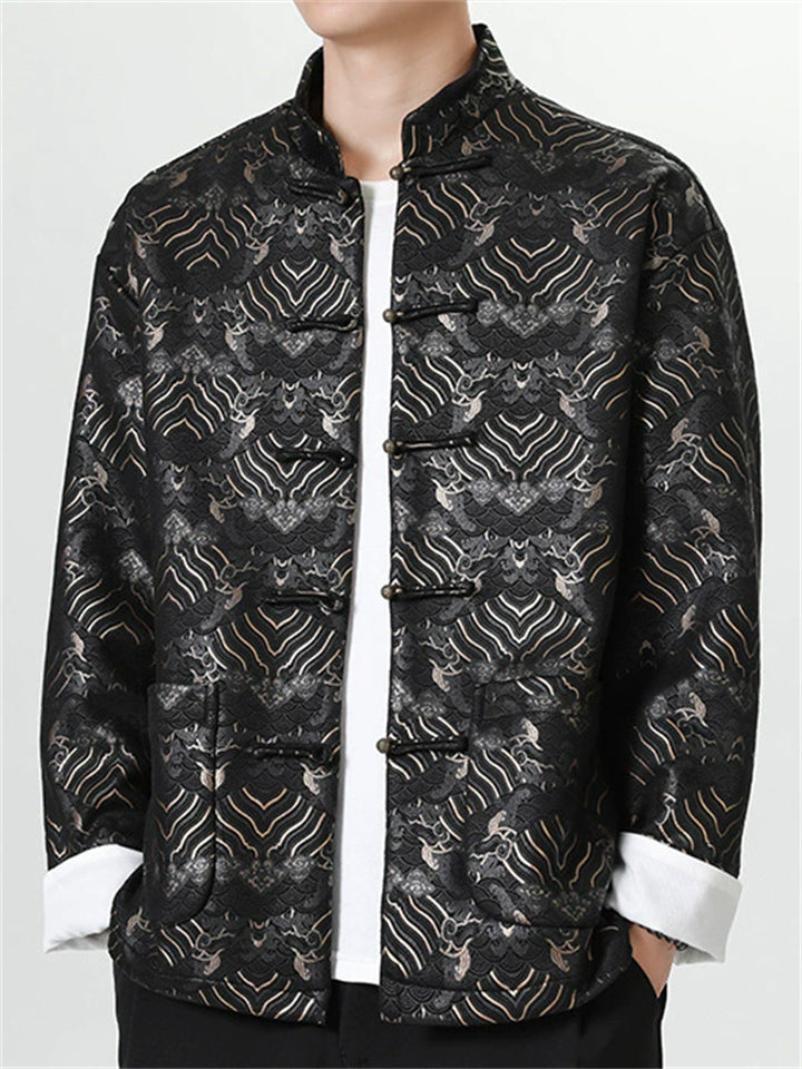 Men's Chinese Style Wave Pattern Print Stand Collar Button-Up TangSuit Jackets