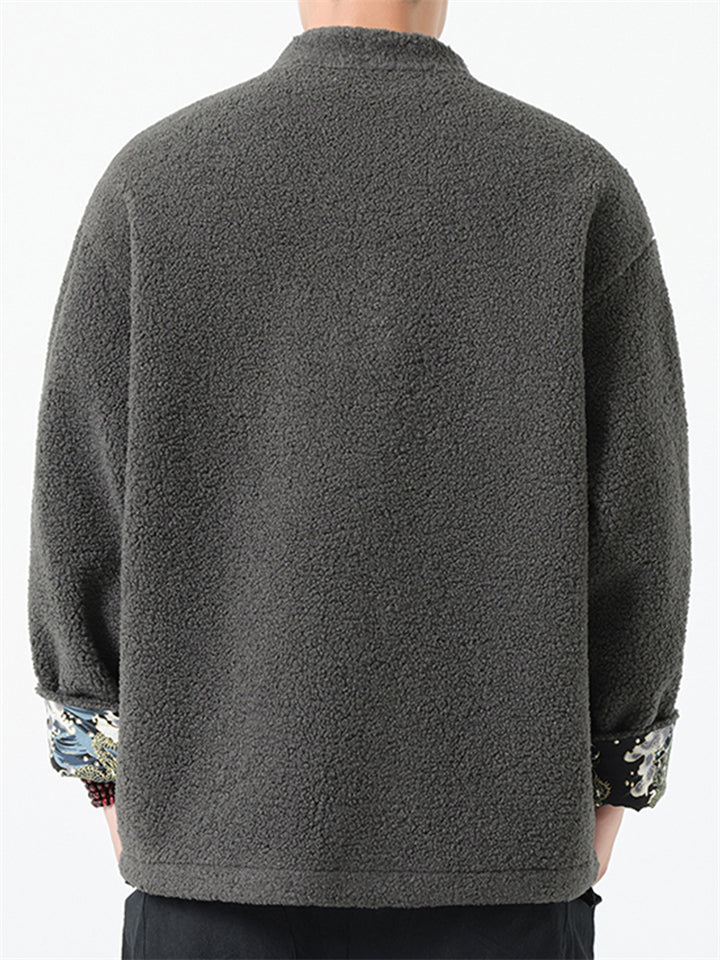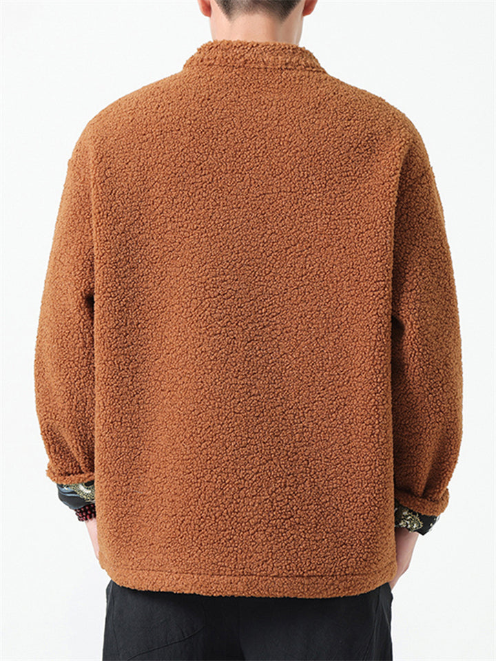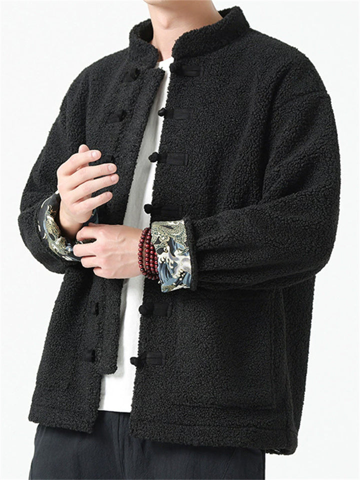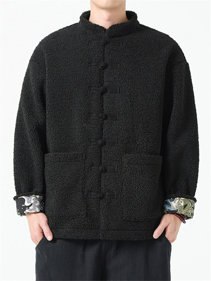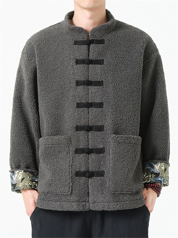 Men's Winter Thermal Lined Chinese Tunic Suit Fleece Coat with Pockets