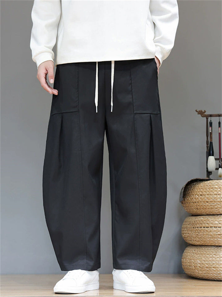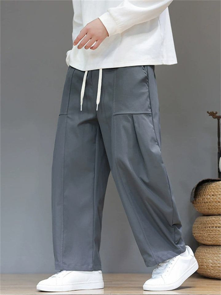 Men's Japanese Style Simple Pleated Drawstring Wide Leg Pants with Pockets