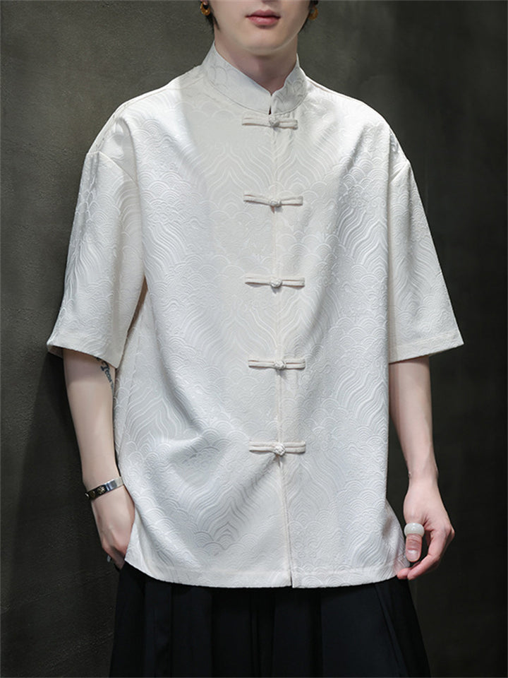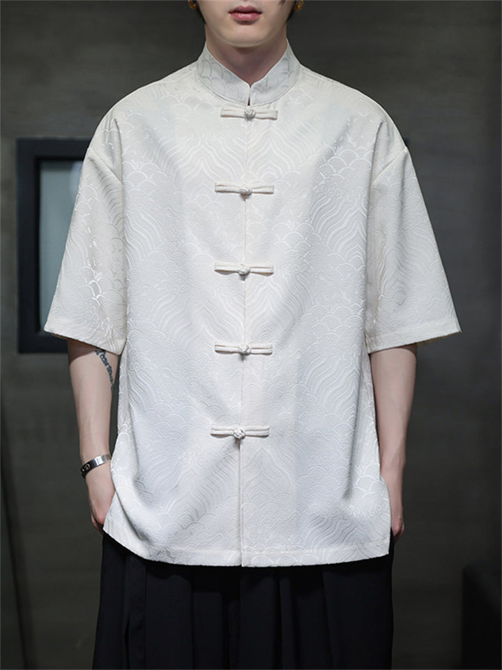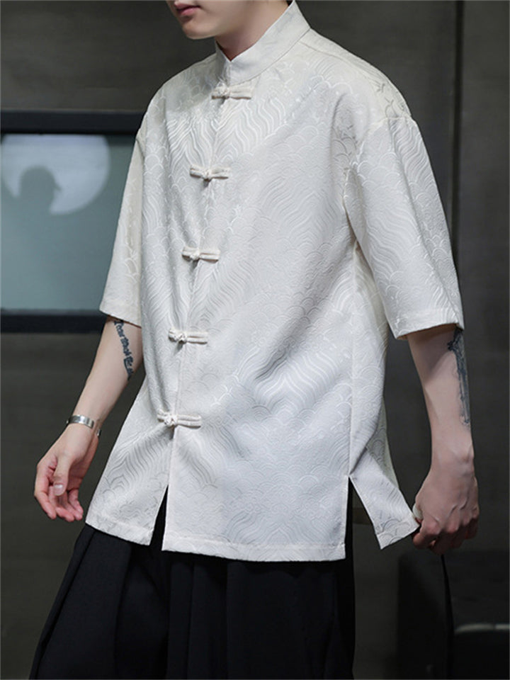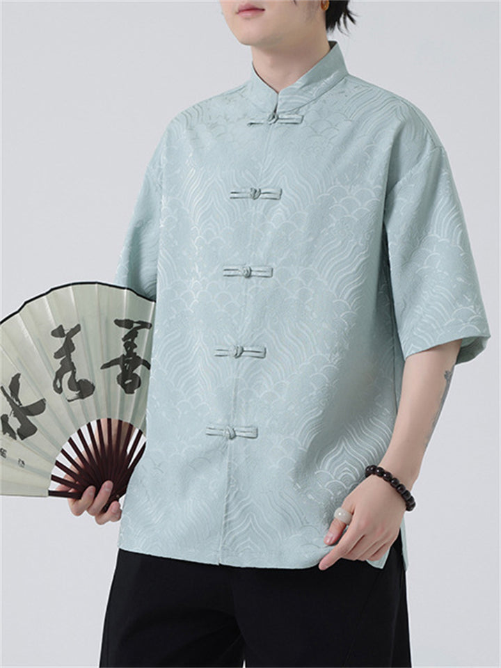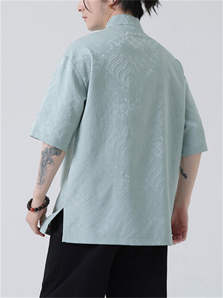 Men's 2Pcs Cool Zen Style Stand Collar Half Sleeve Solid Color Outfits
