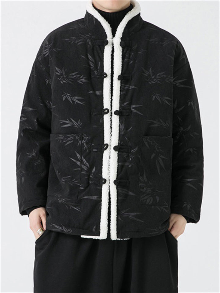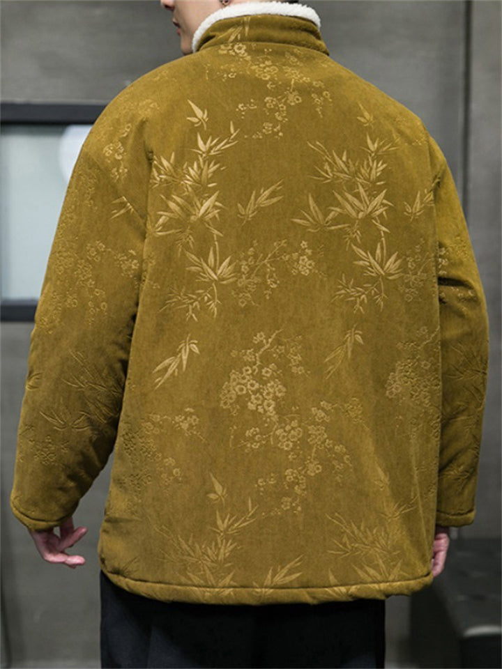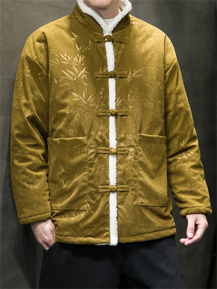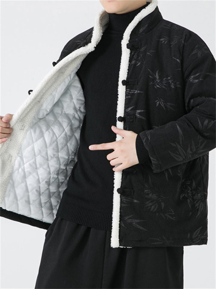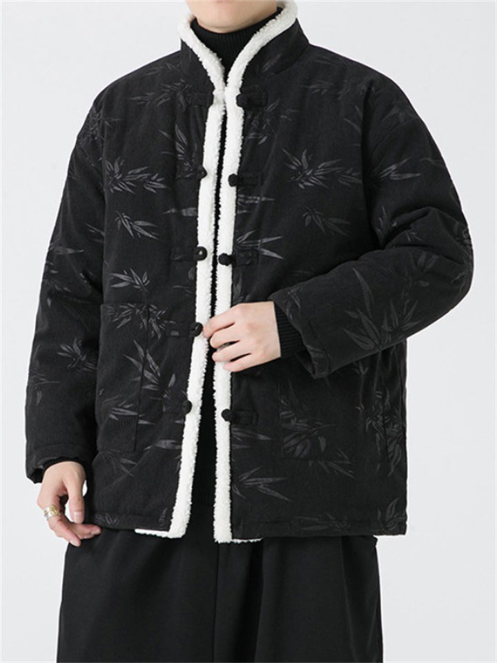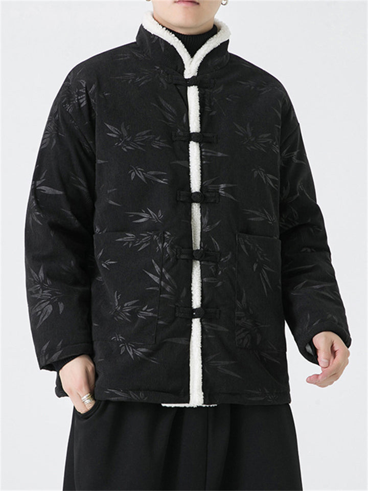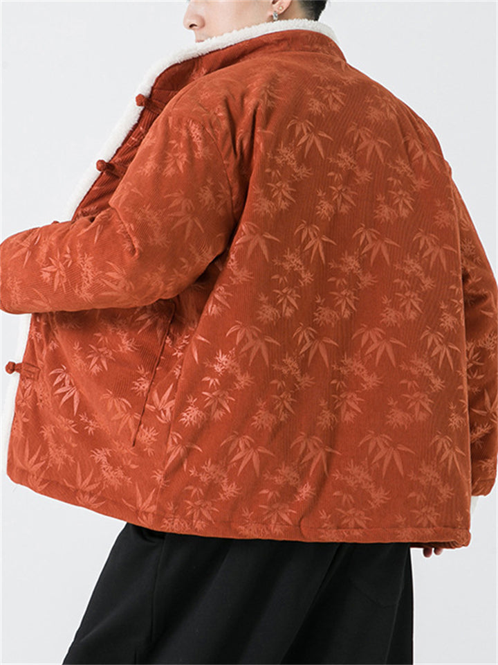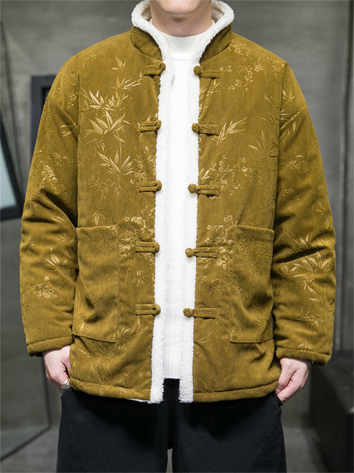 Male Chinese Style Bamboo Leaf Flower Print Corduroy Coats