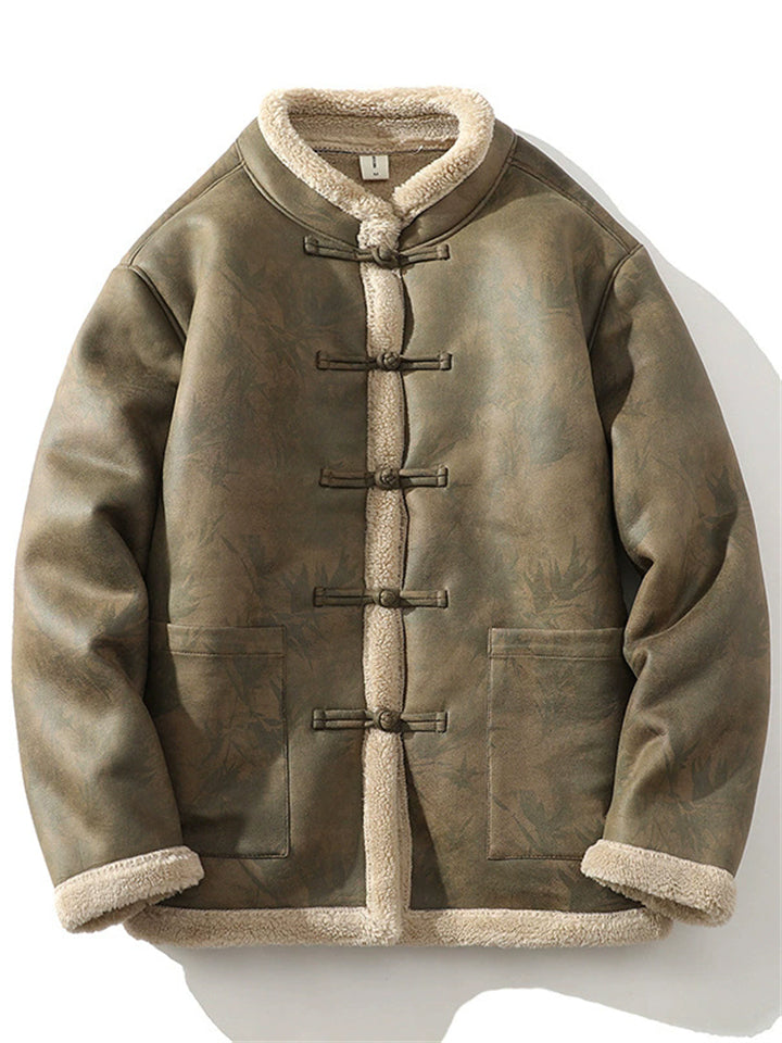 Fleece Mandarin Collar Coat for Men with Traditional Chinese Buttons