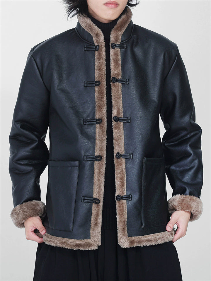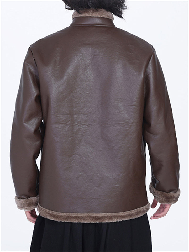 Fleece Mandarin Collar Coat for Men with Traditional Chinese Buttons