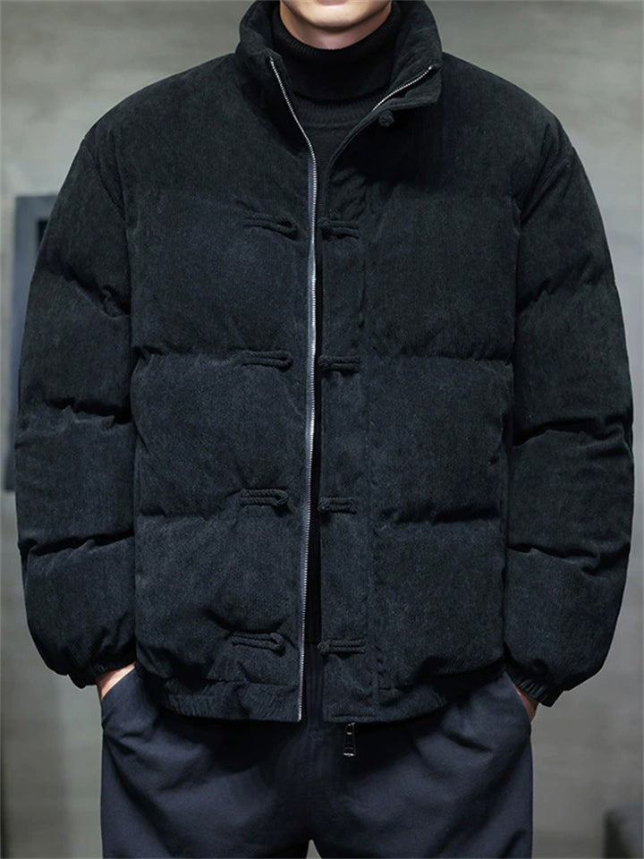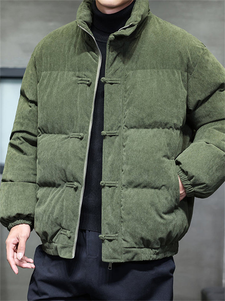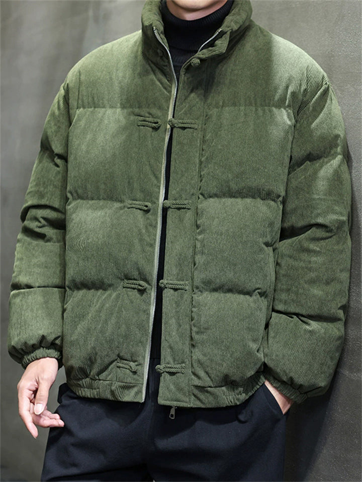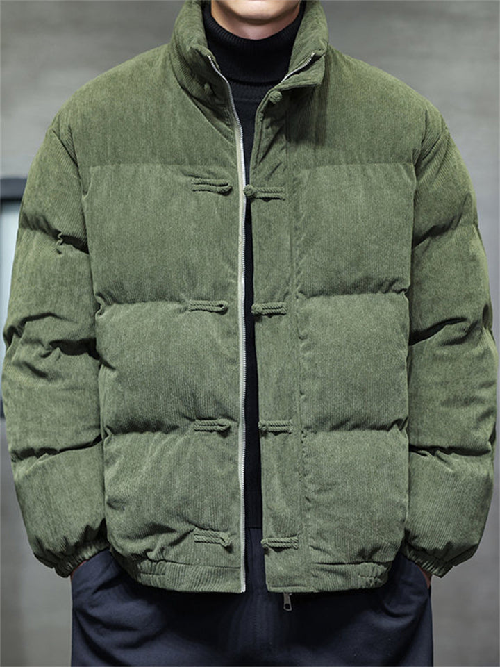 Winter Warm Corduroy Stand Collar Frog Button Puffer Coat for Men