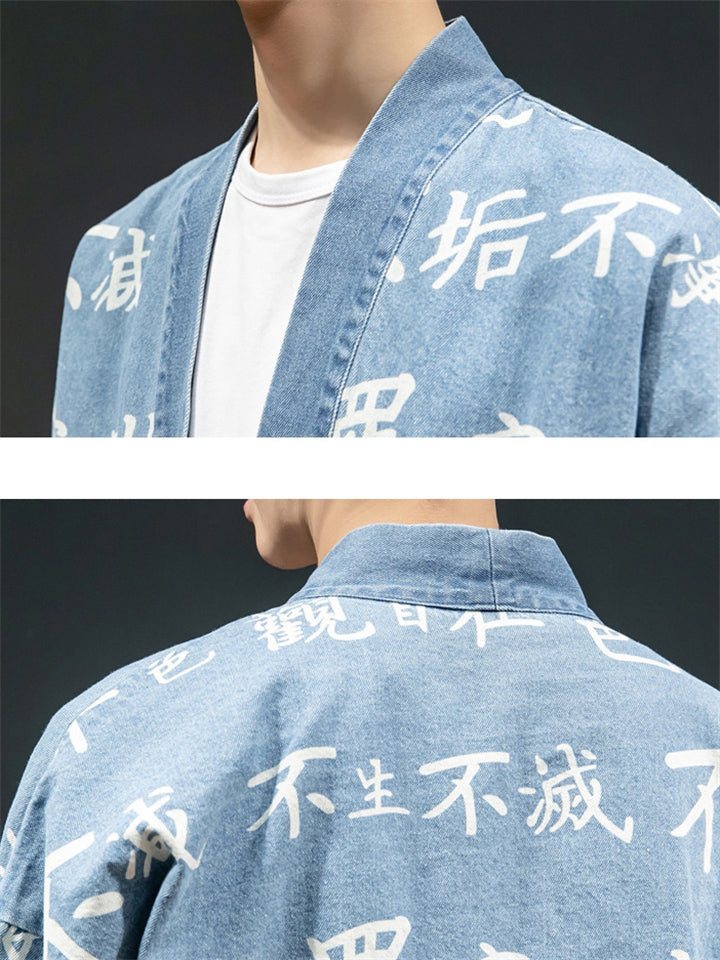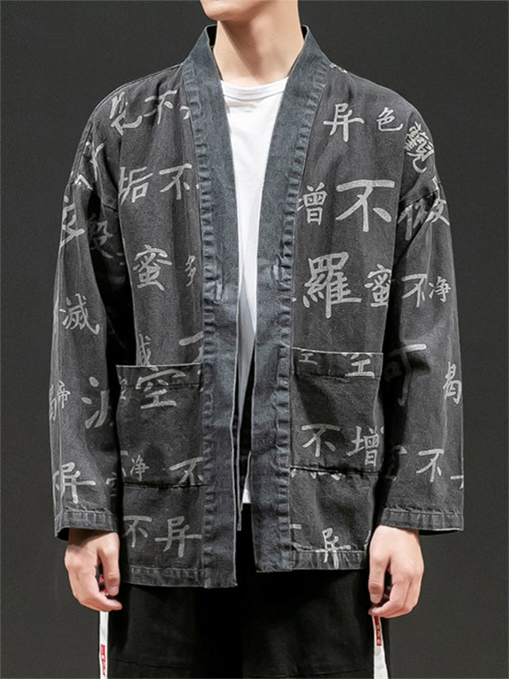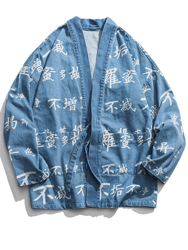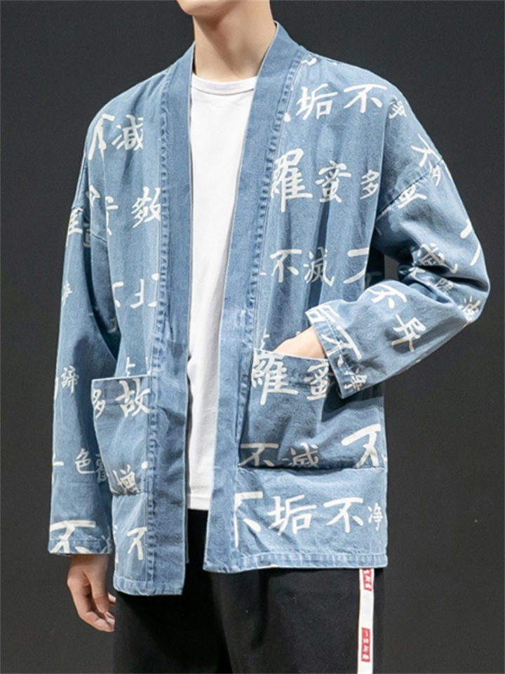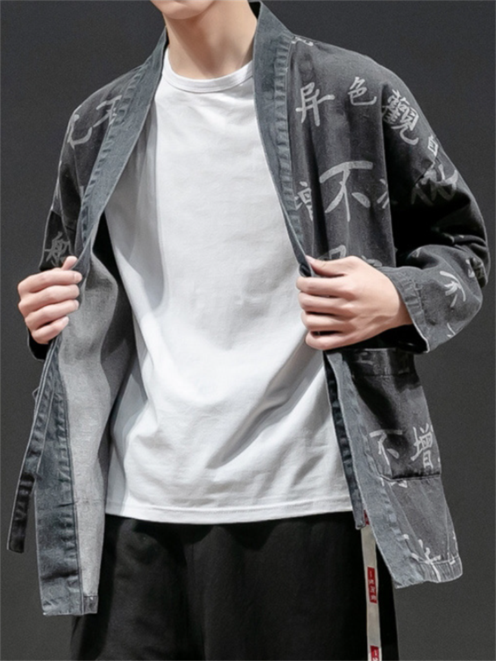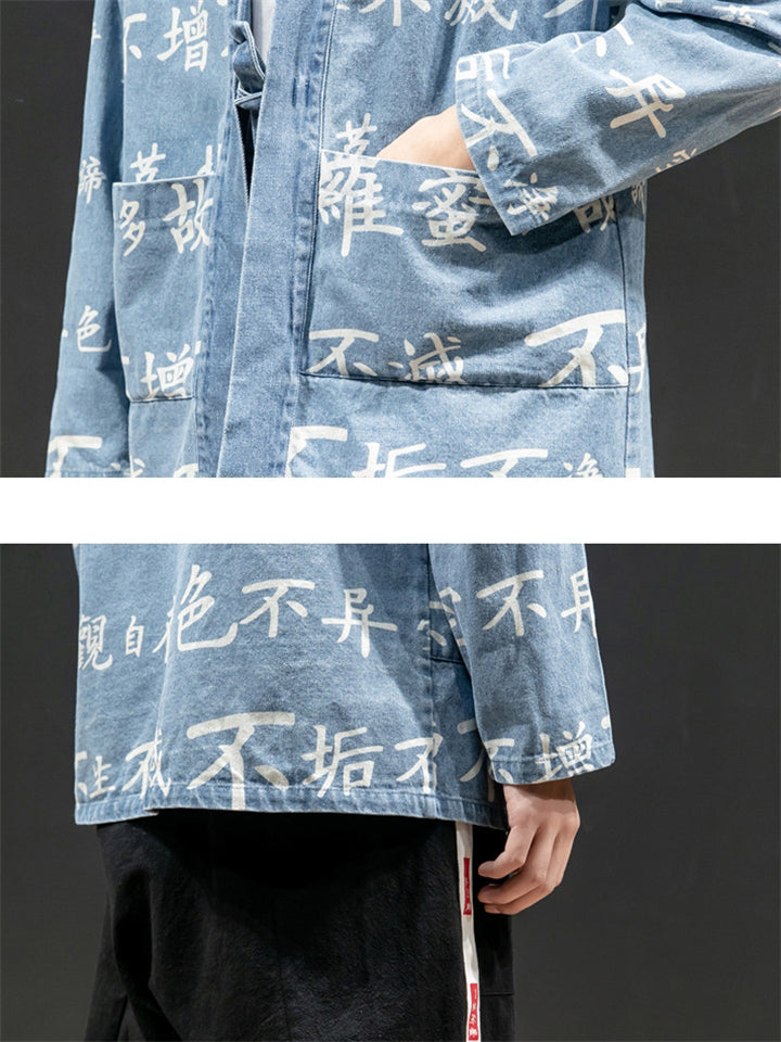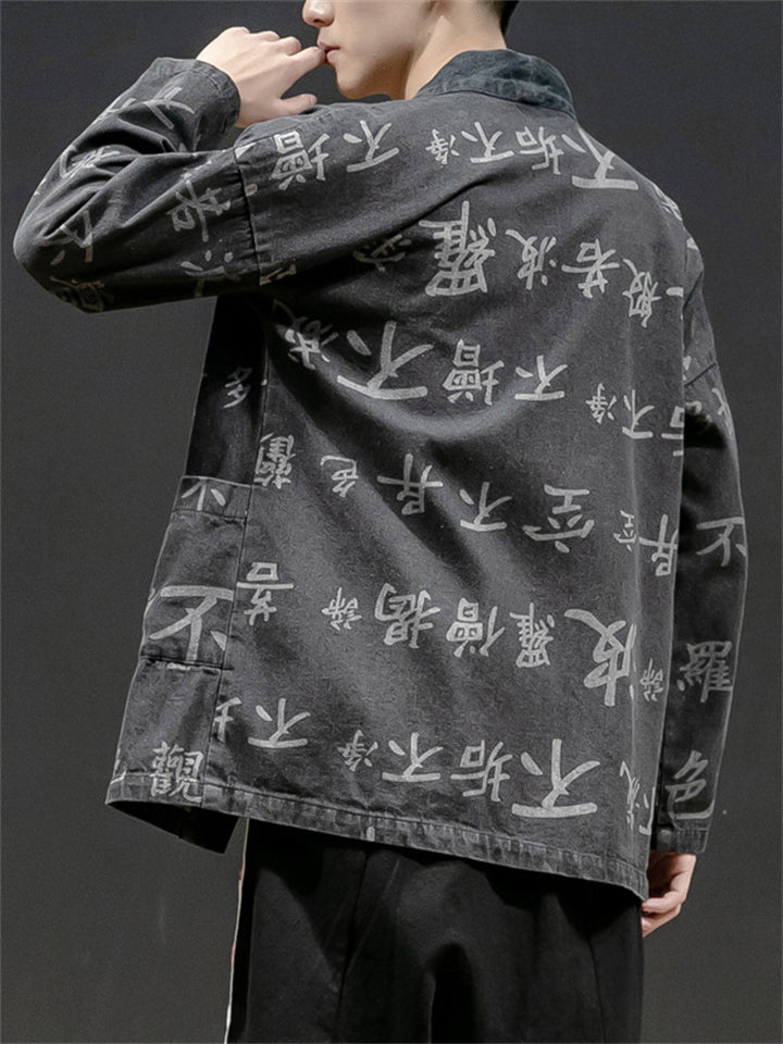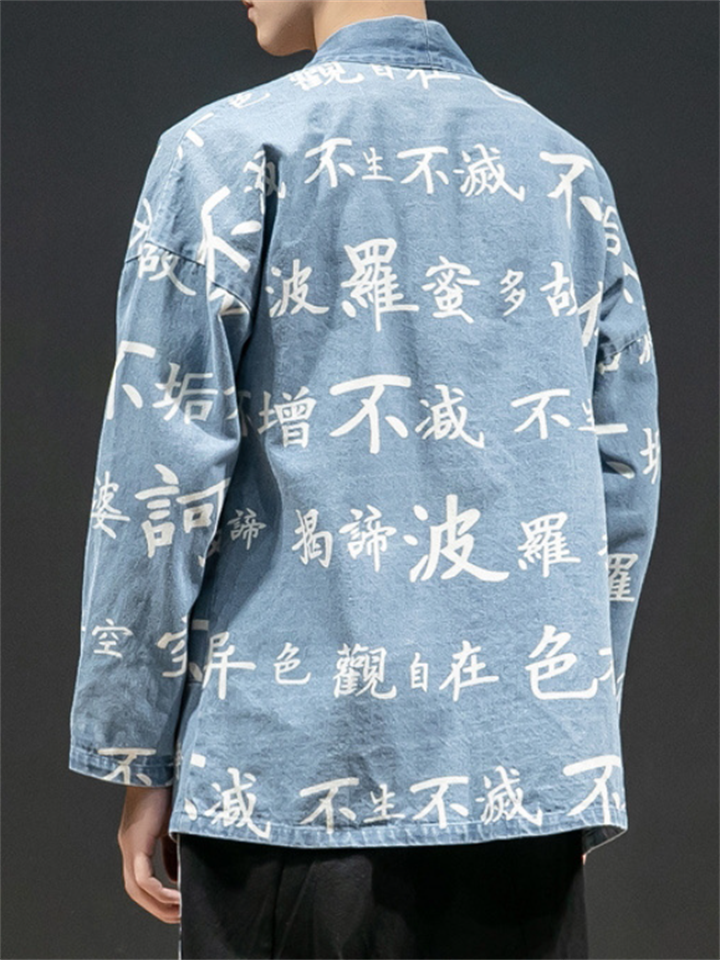 Chinese Style Hanzi Print Front Lace Up Denim Jacket for Men