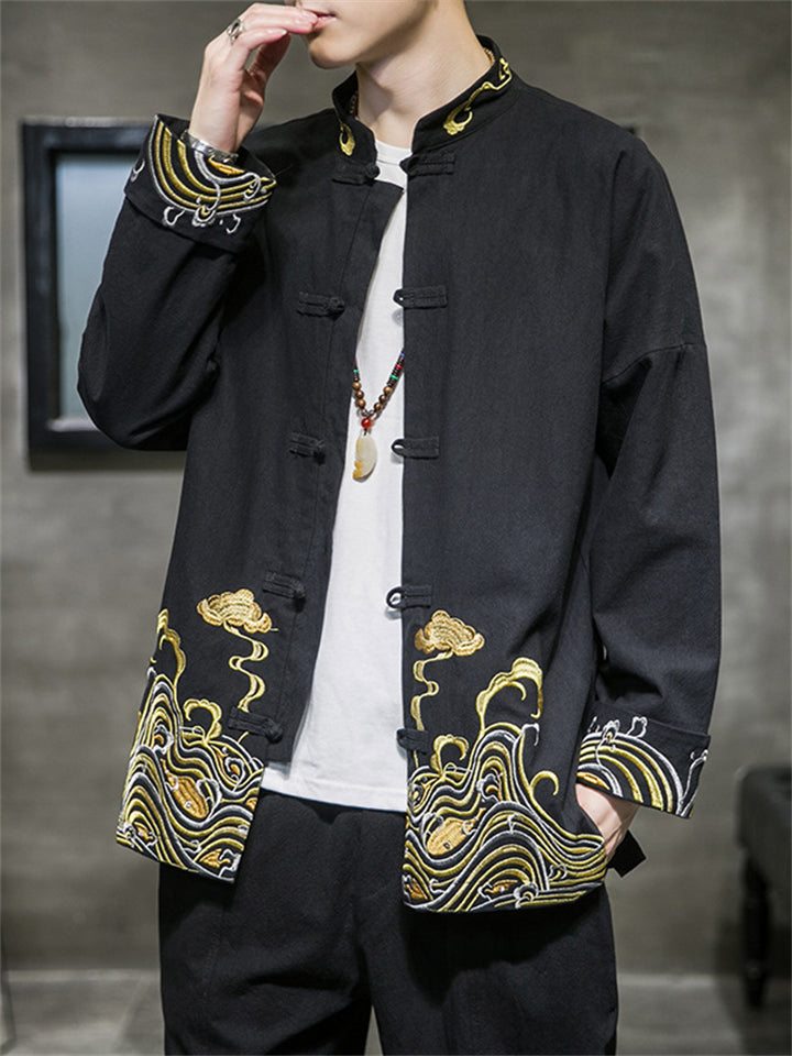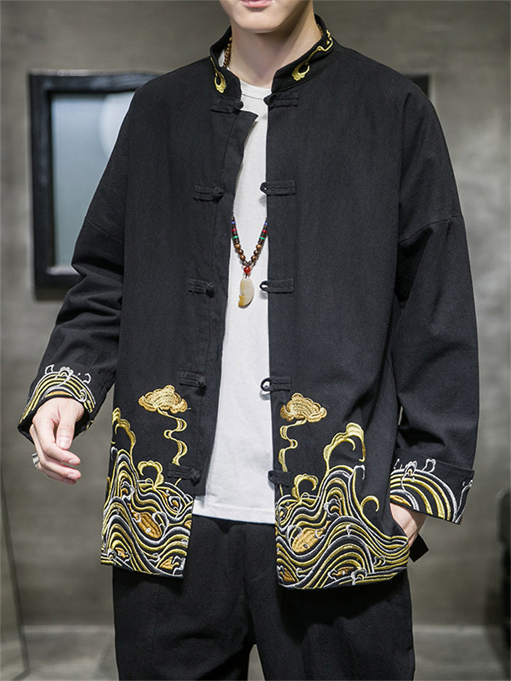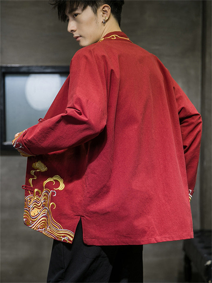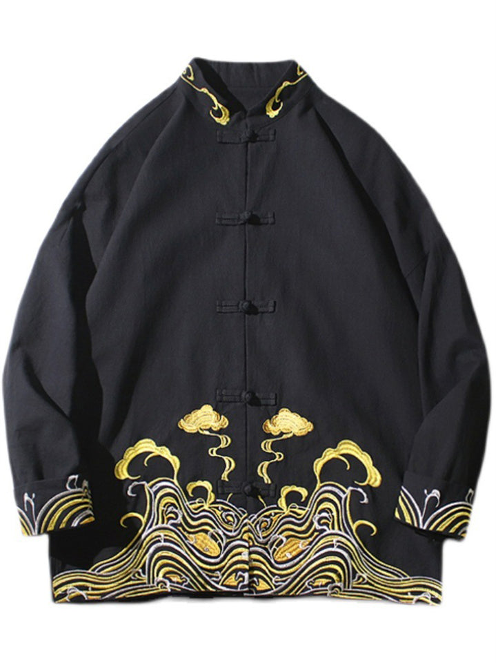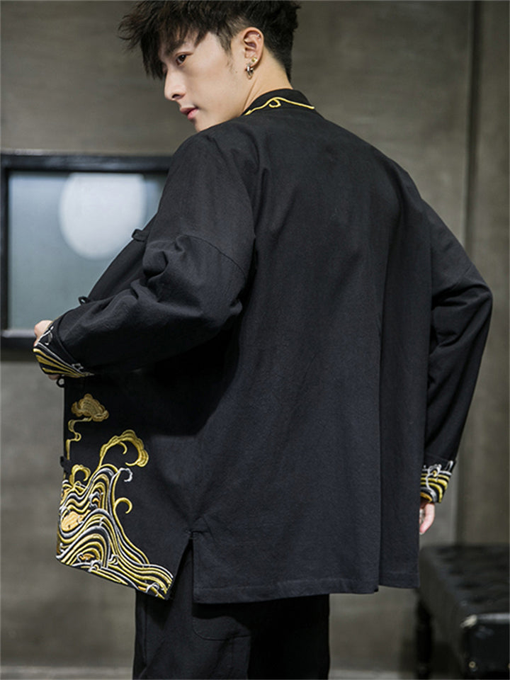 Men's Autumn Cartoon Loong Print Stand Collar Tangsuit Cardigan Jackets