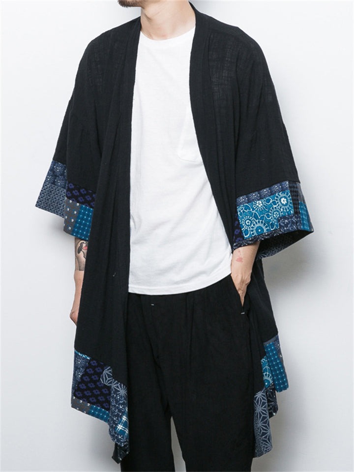 Men's Chinese Style Black Jacquard Corduroy Hooded Cloak Robe Jackets