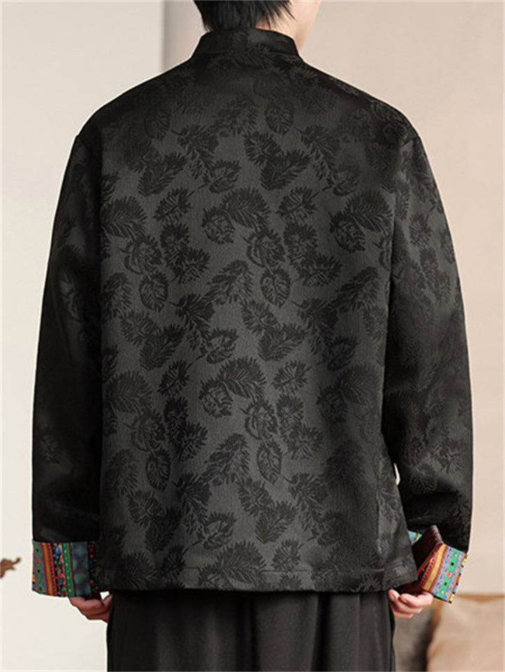 Men's Chinese Style Faux Suede Stand Collar Loose Fit Jacket with Leaf Print