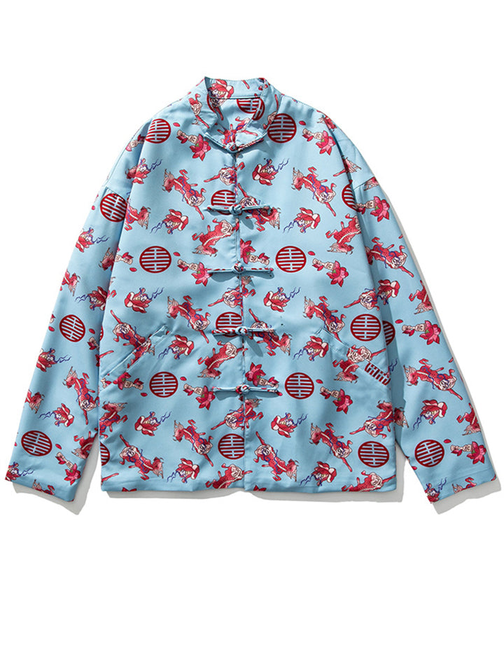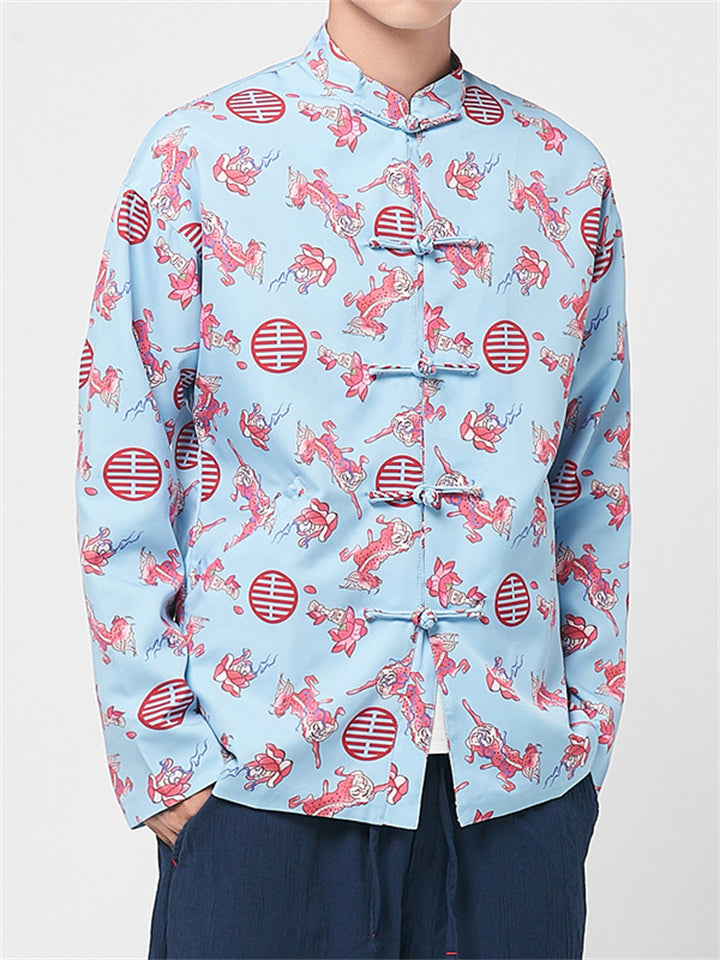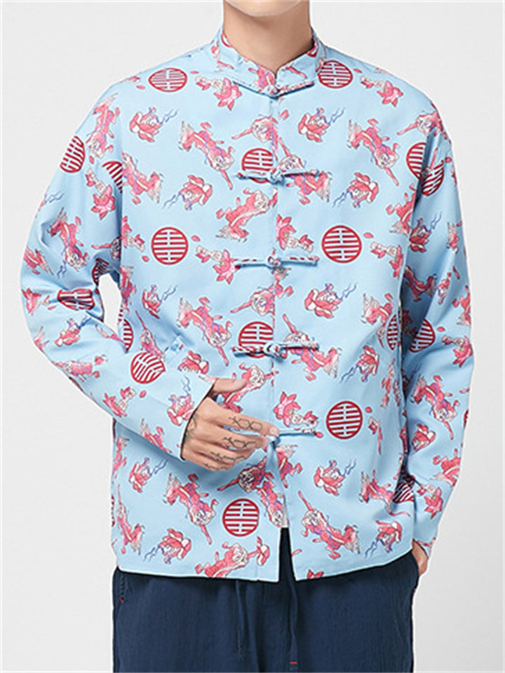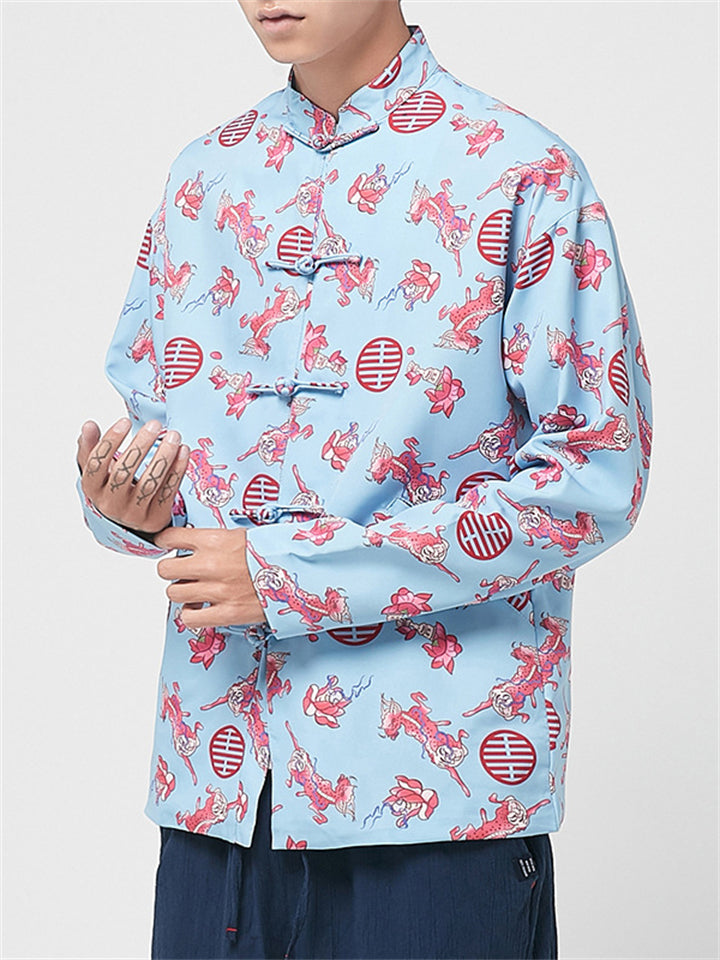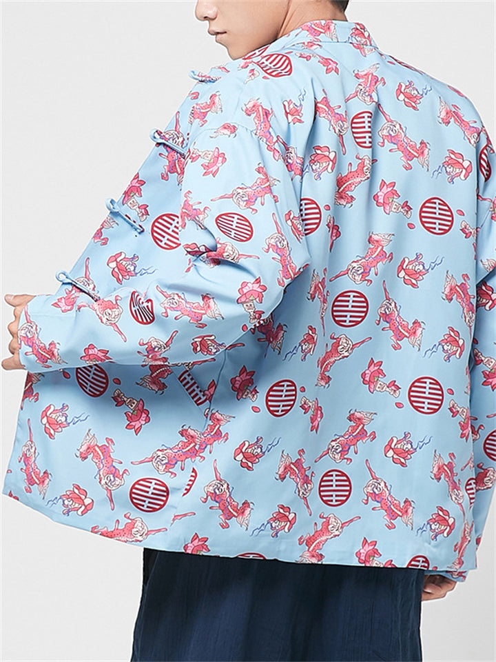 Men's Autumn Cartoon Loong Print Stand Collar Tangsuit Cardigan Jackets