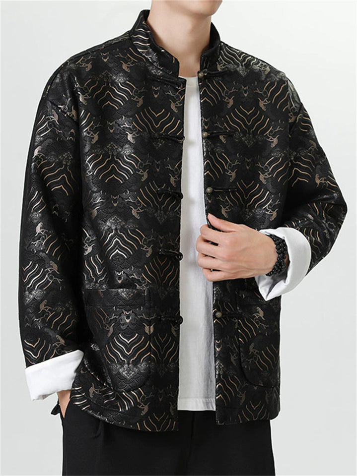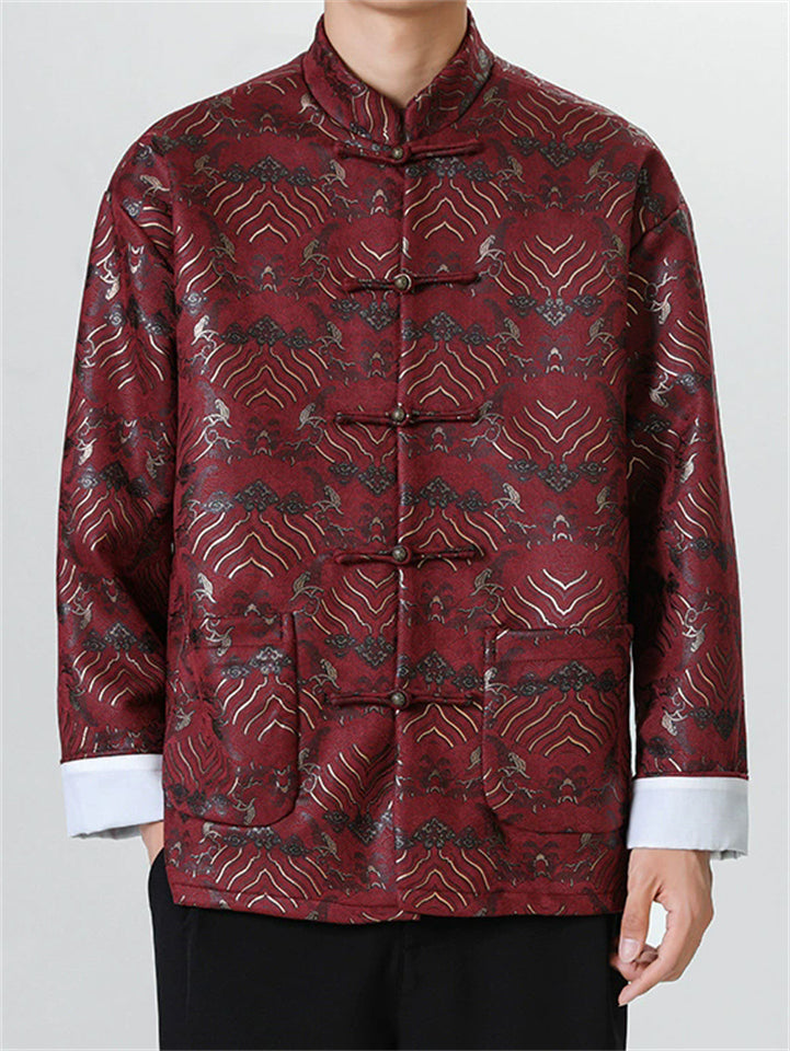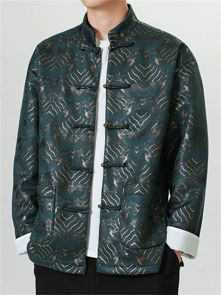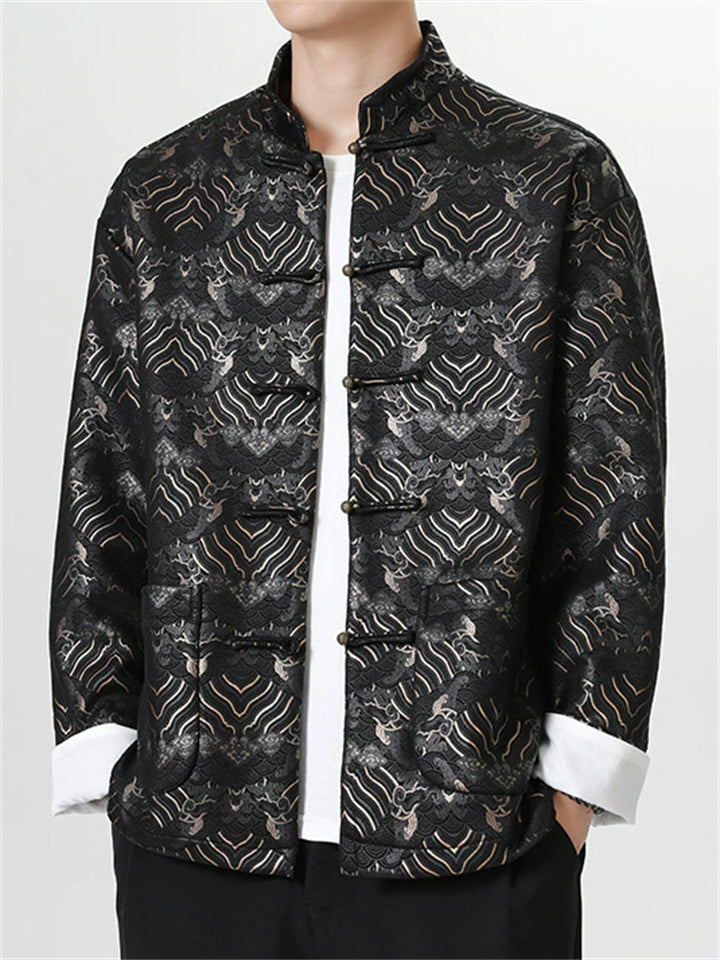 Men's Chinese Style Wave Pattern Print Stand Collar Button-Up TangSuit Jackets