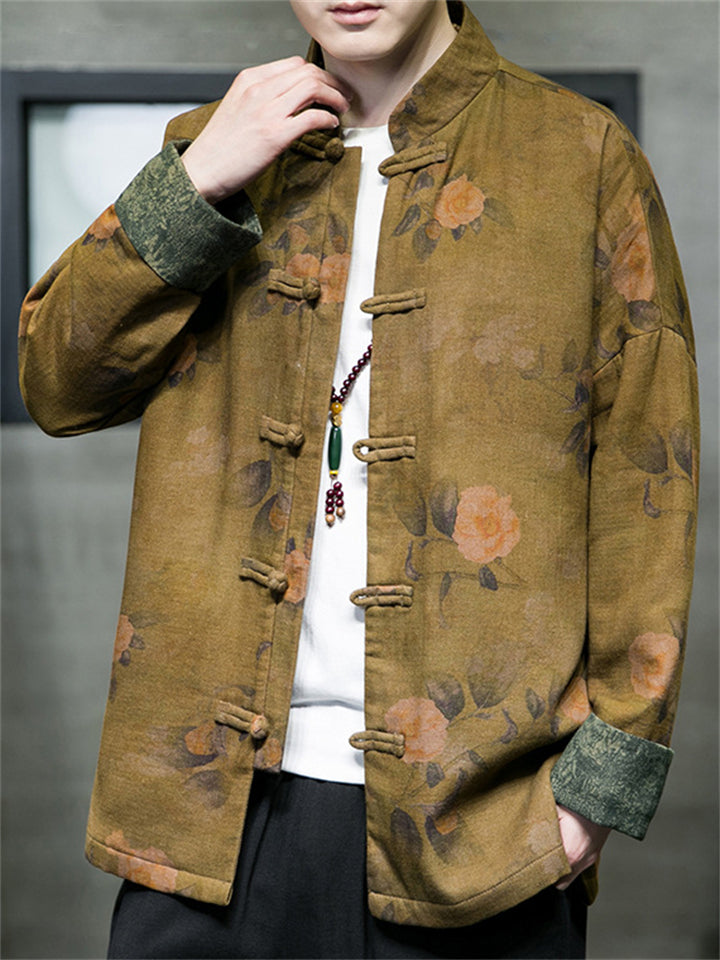 Men's Autumn Peaches Print Stand Collar Tangsuit Cardigan Jackets