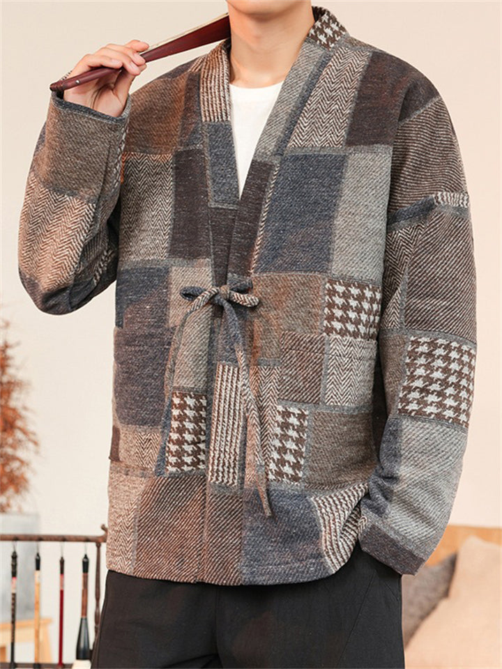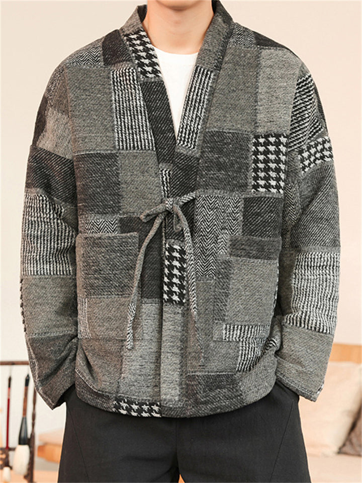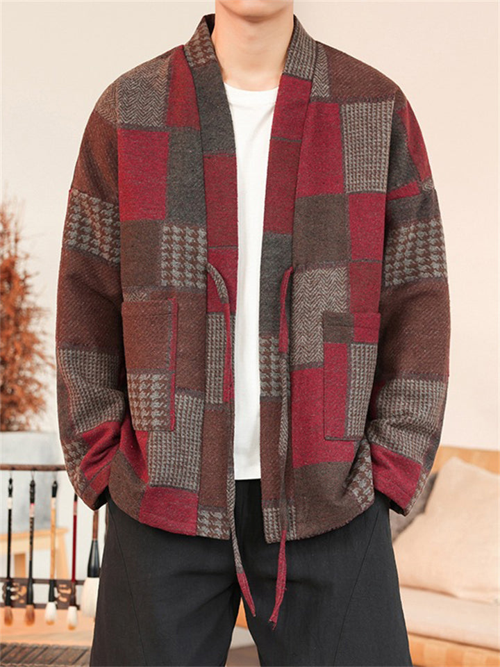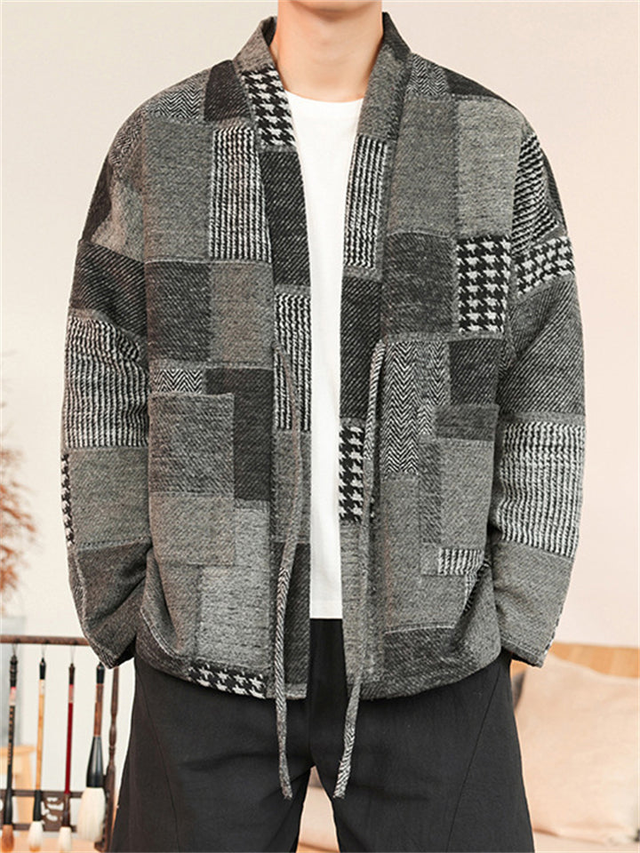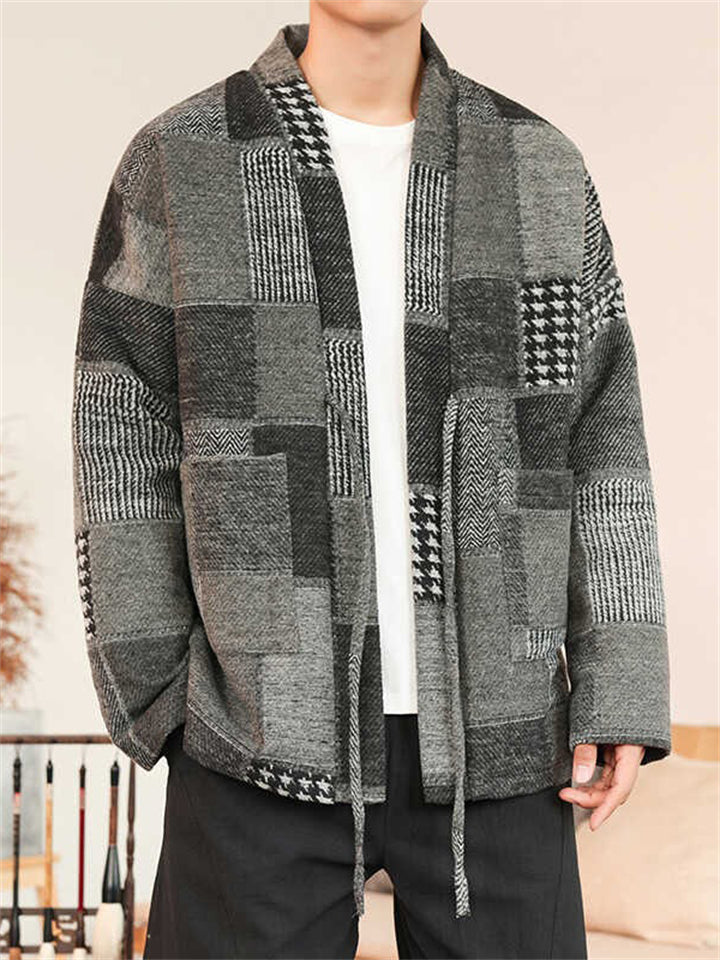 Men's Color Block Patchwork Front Lace Up Loose Jacket