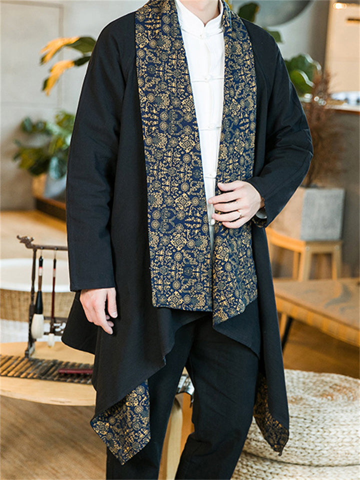 Men's Chinese Style Black Jacquard Corduroy Hooded Cloak Robe Jackets