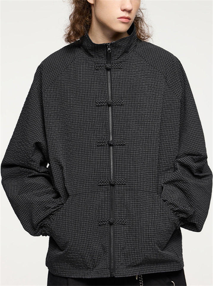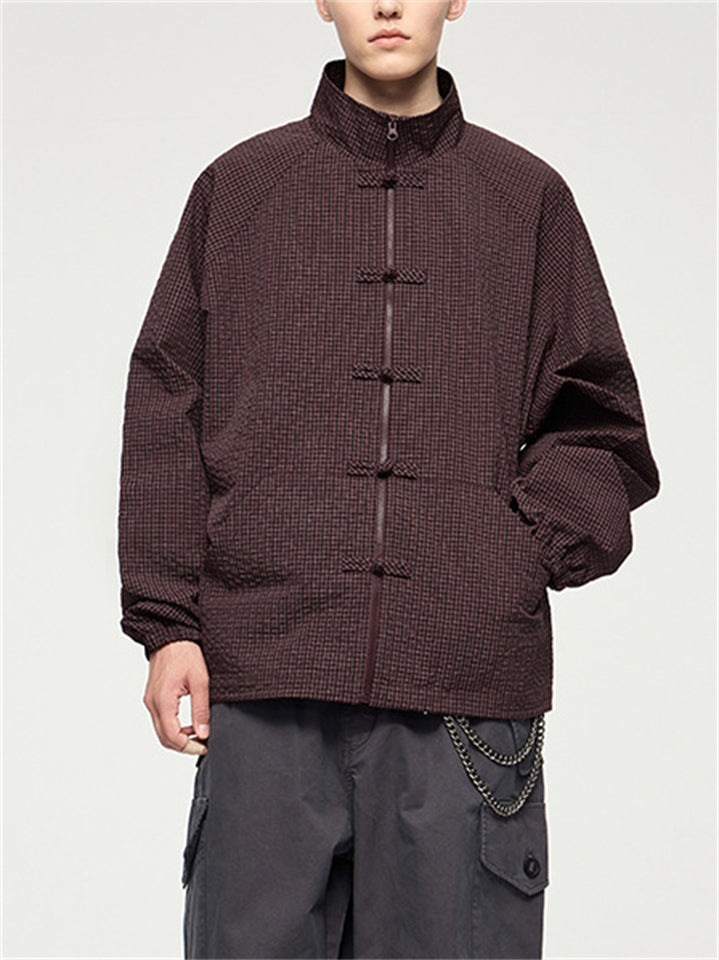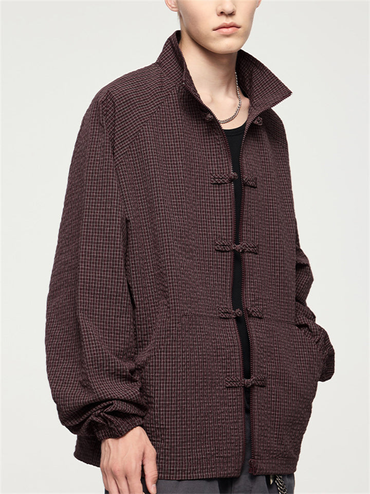 Men's Frog Button Plaid Jacket Long Sleeve Coat