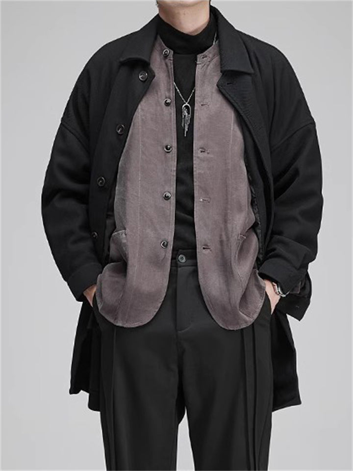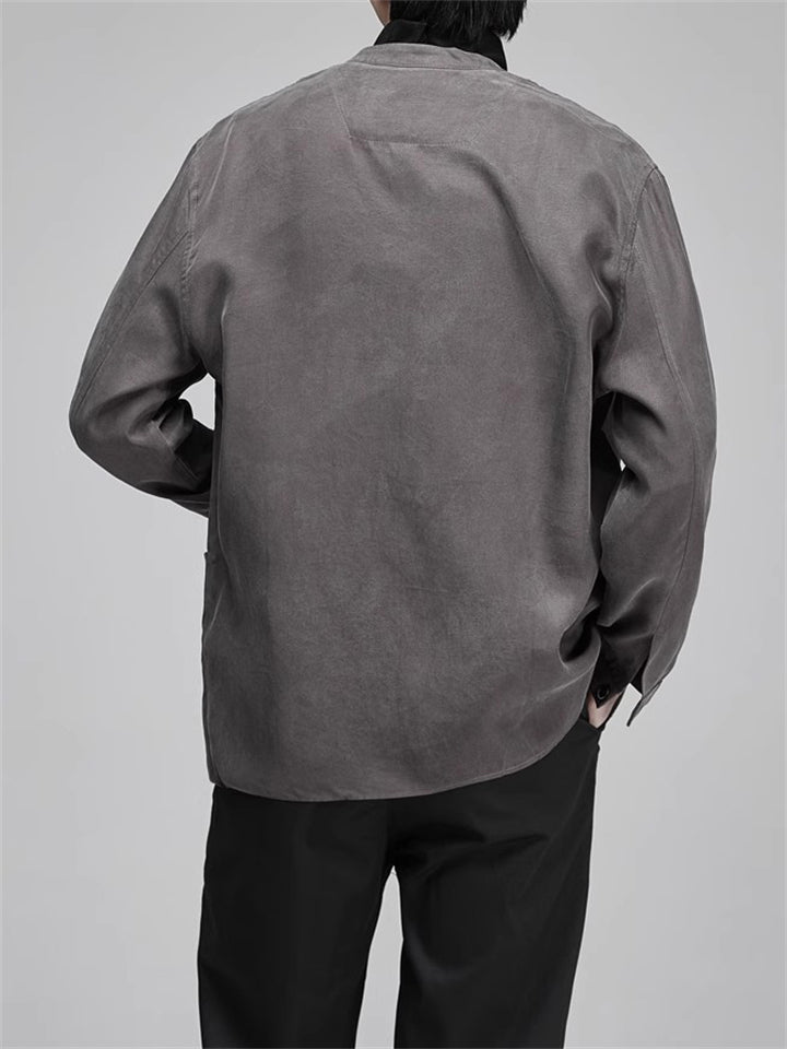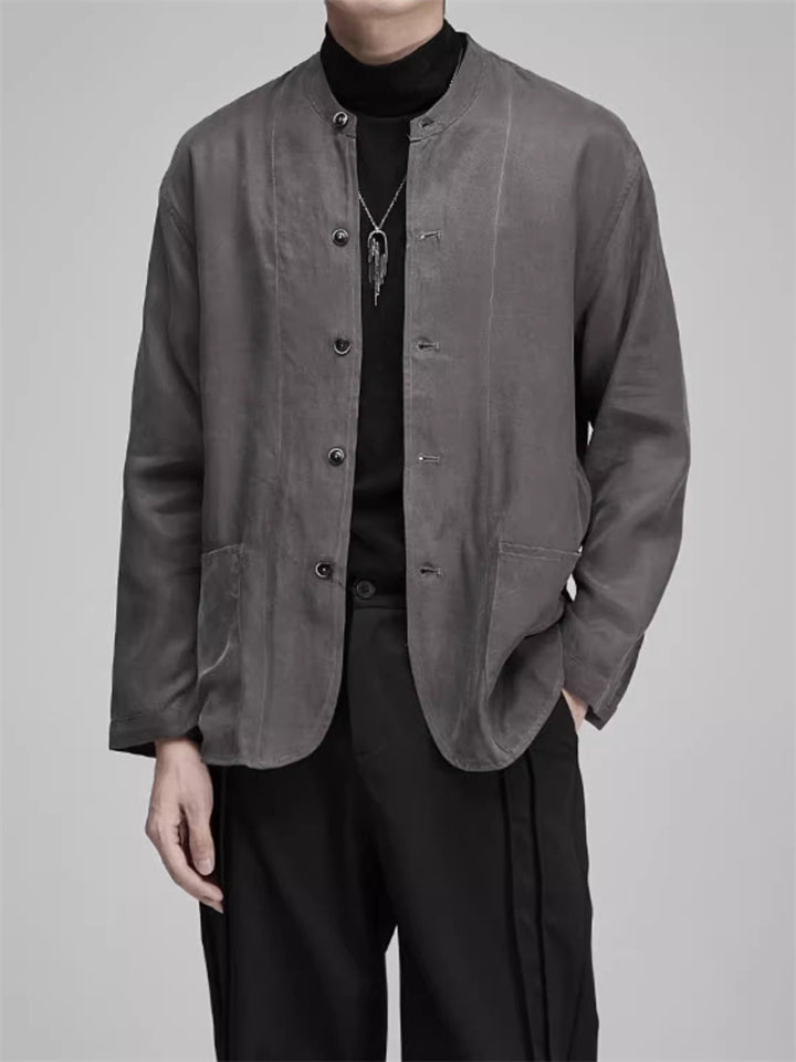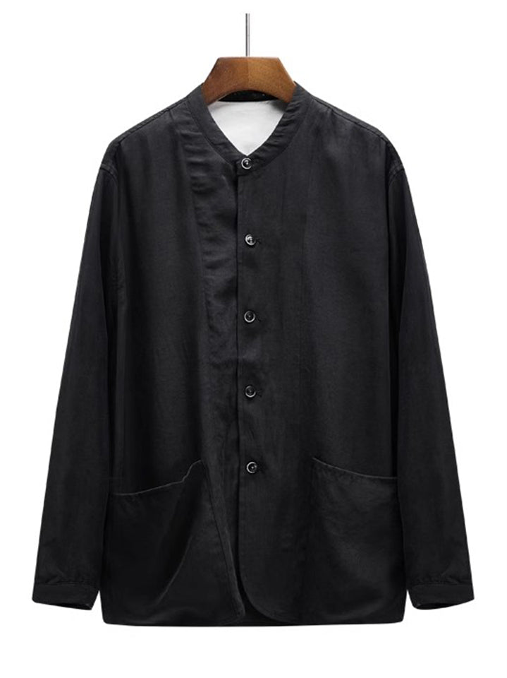 Men's Japanese Style Retro Tencel Solid Color Collarless Casual Suit Jackets