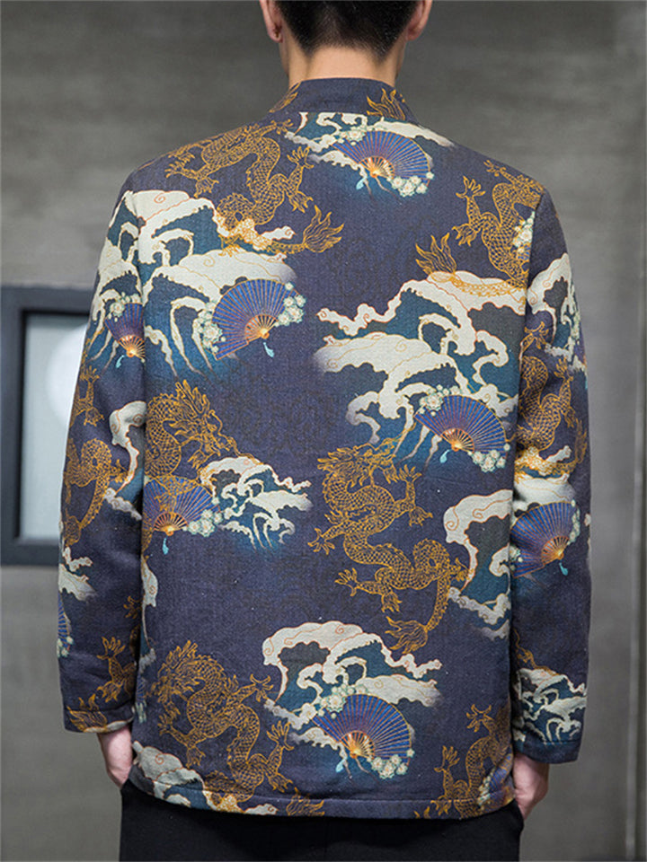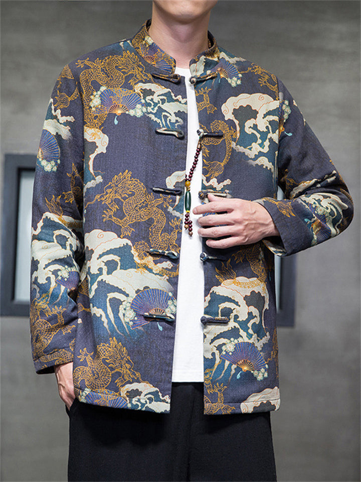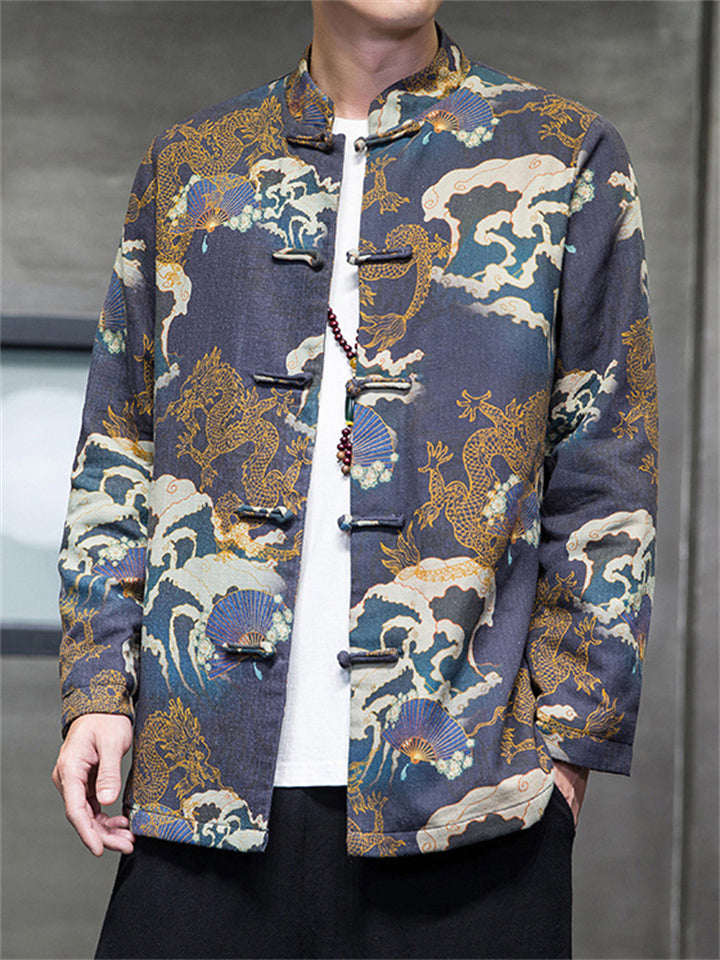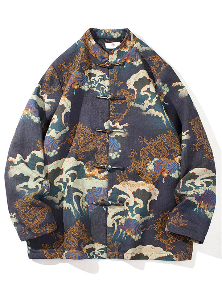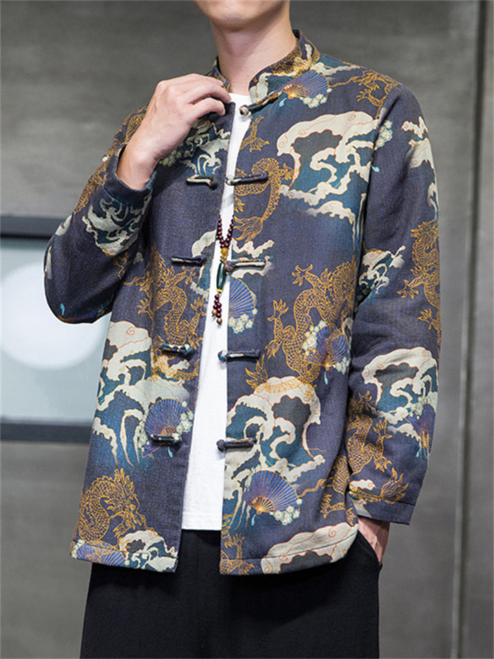 Men's Autumn Cartoon Loong Print Stand Collar Tangsuit Cardigan Jackets