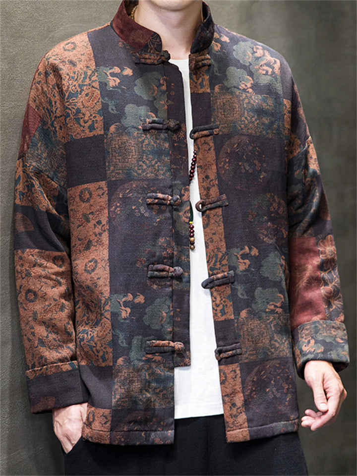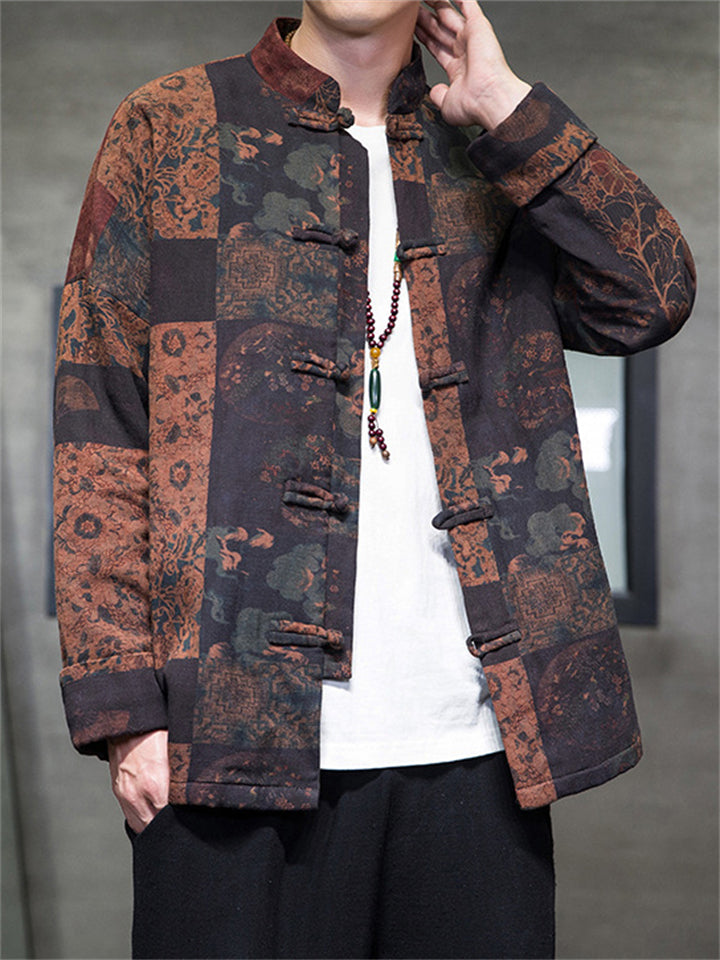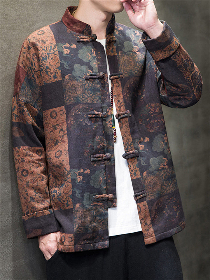 Men's Stand Collar Button Up Vintage Printed Tang Suit Jacket