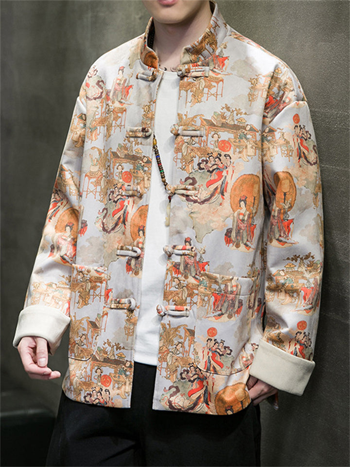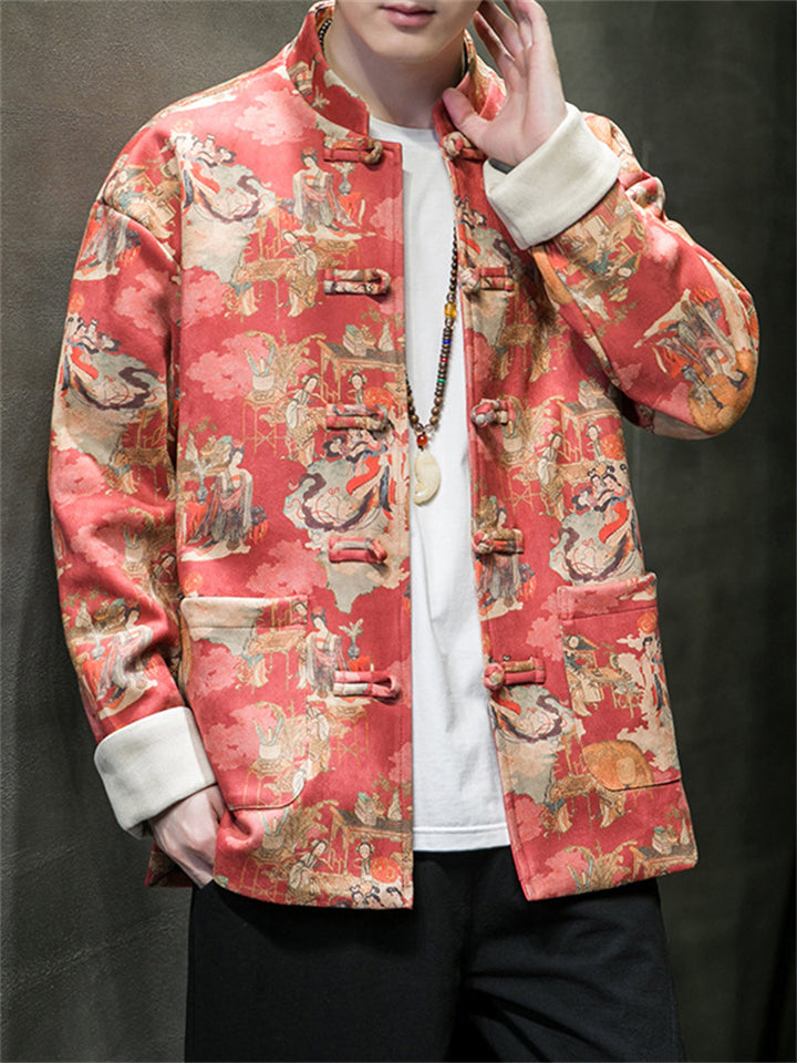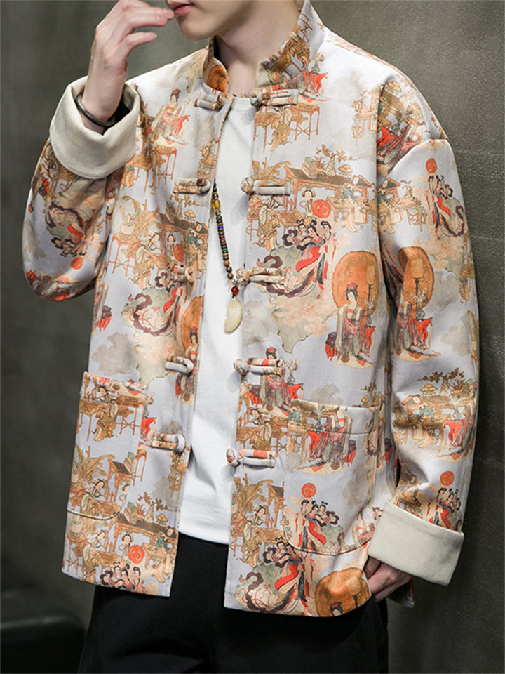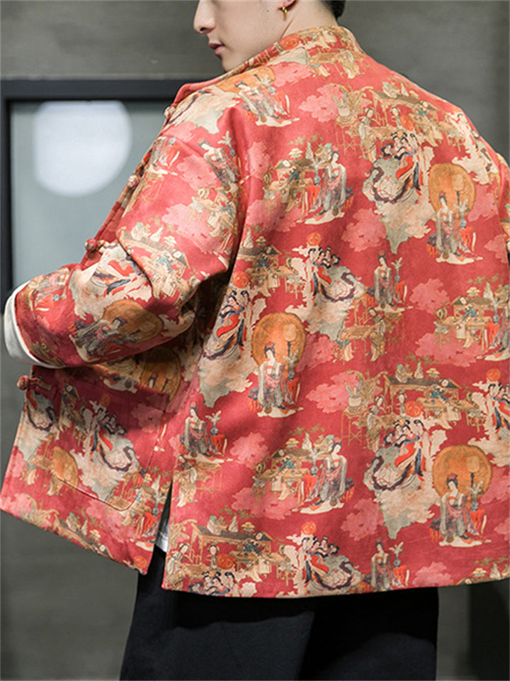 Men's Autumn Peaches Print Stand Collar Tangsuit Cardigan Jackets
