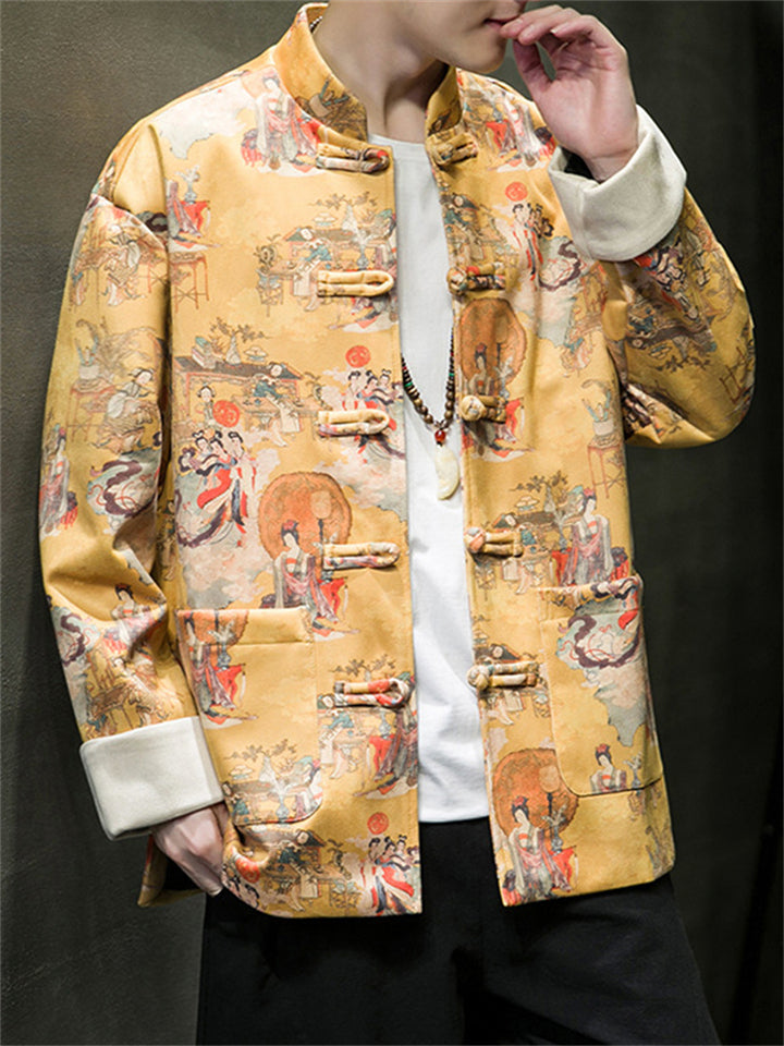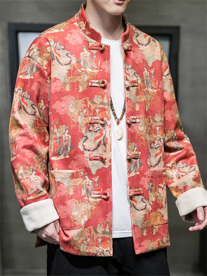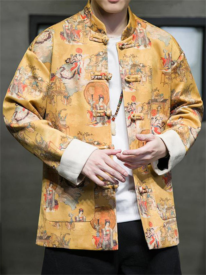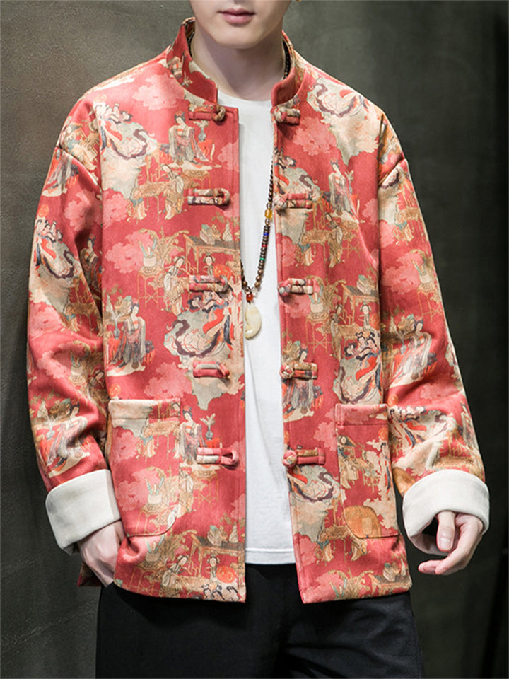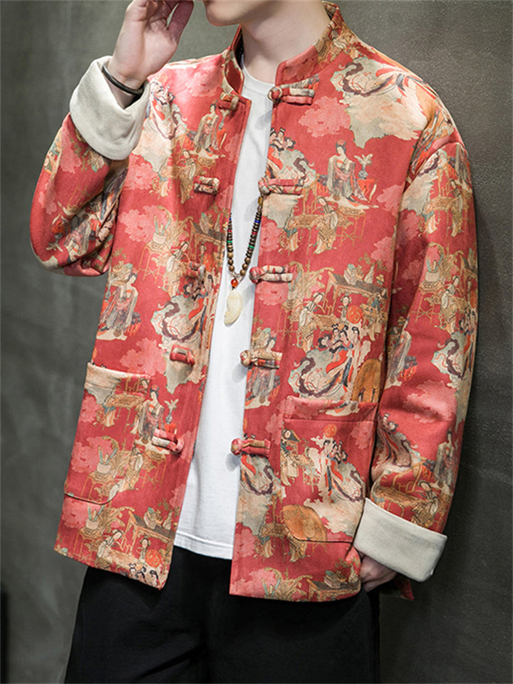 Men's Autumn Peaches Print Stand Collar Tangsuit Cardigan Jackets