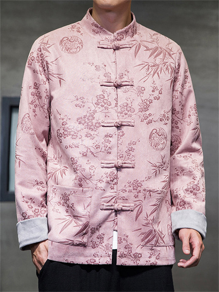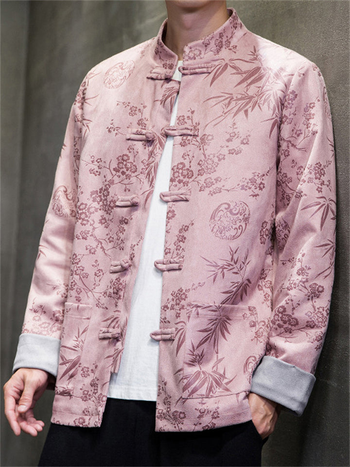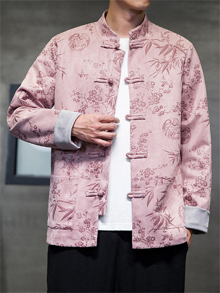 Men's Autumn Peaches Print Stand Collar Tangsuit Cardigan Jackets
