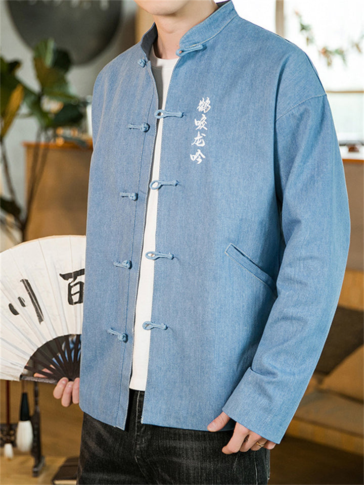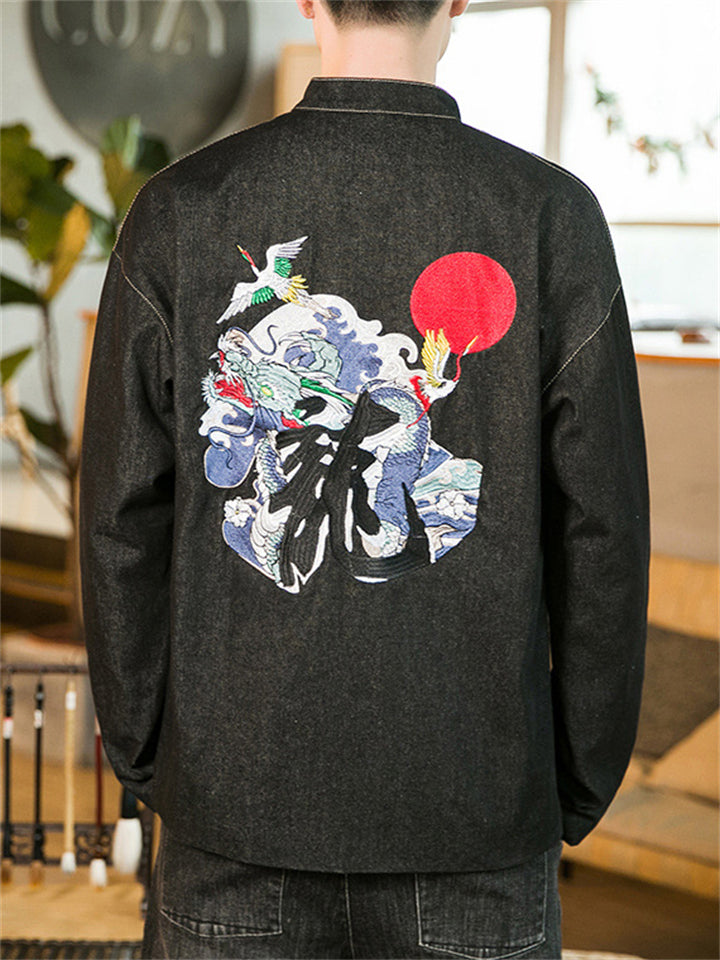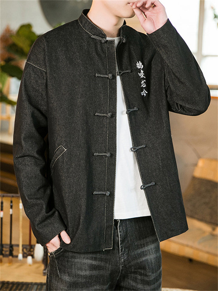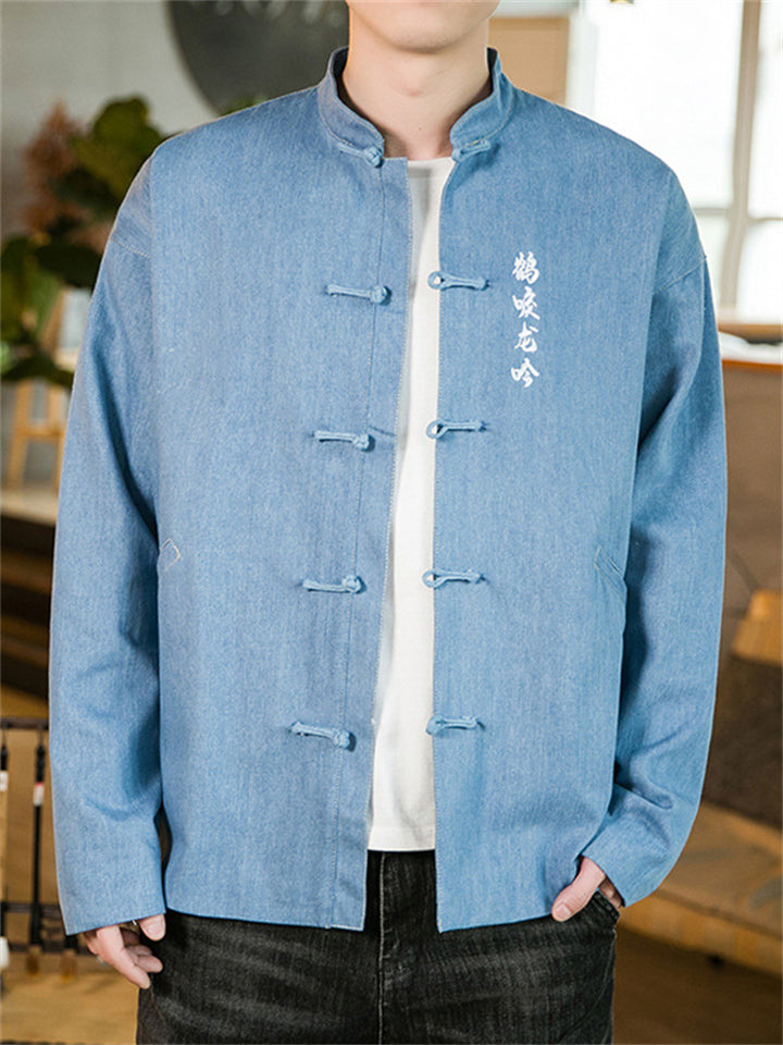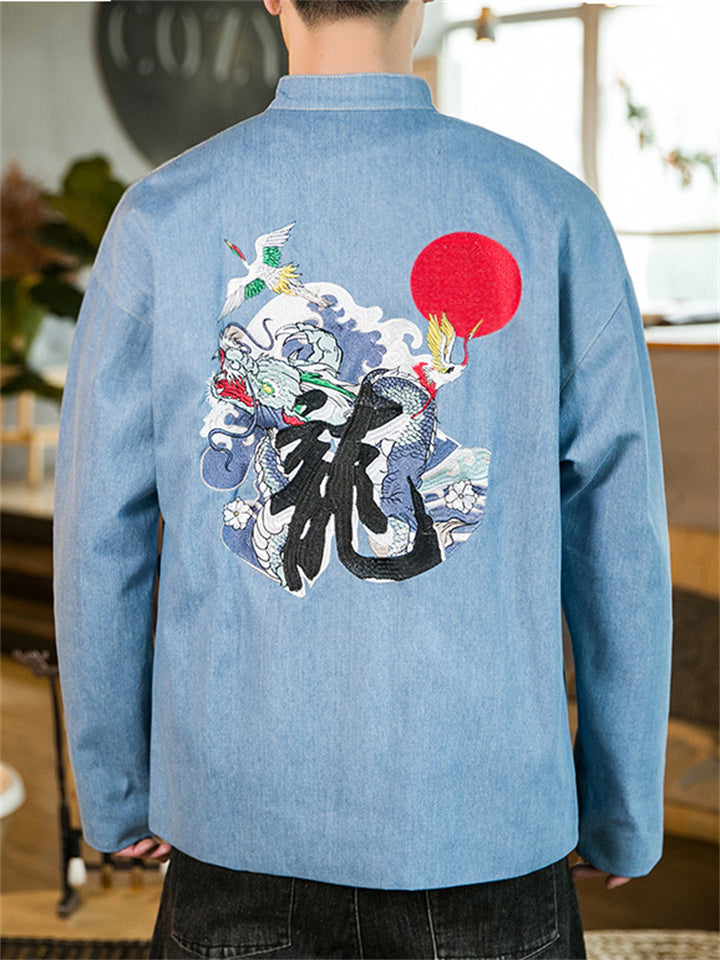 Men's Trendy Stand Collar Knot Button Denim Embroidery Jacket