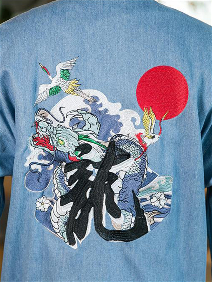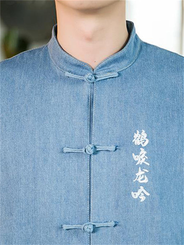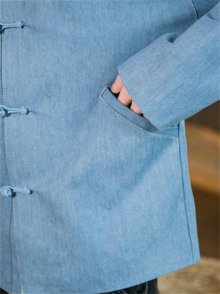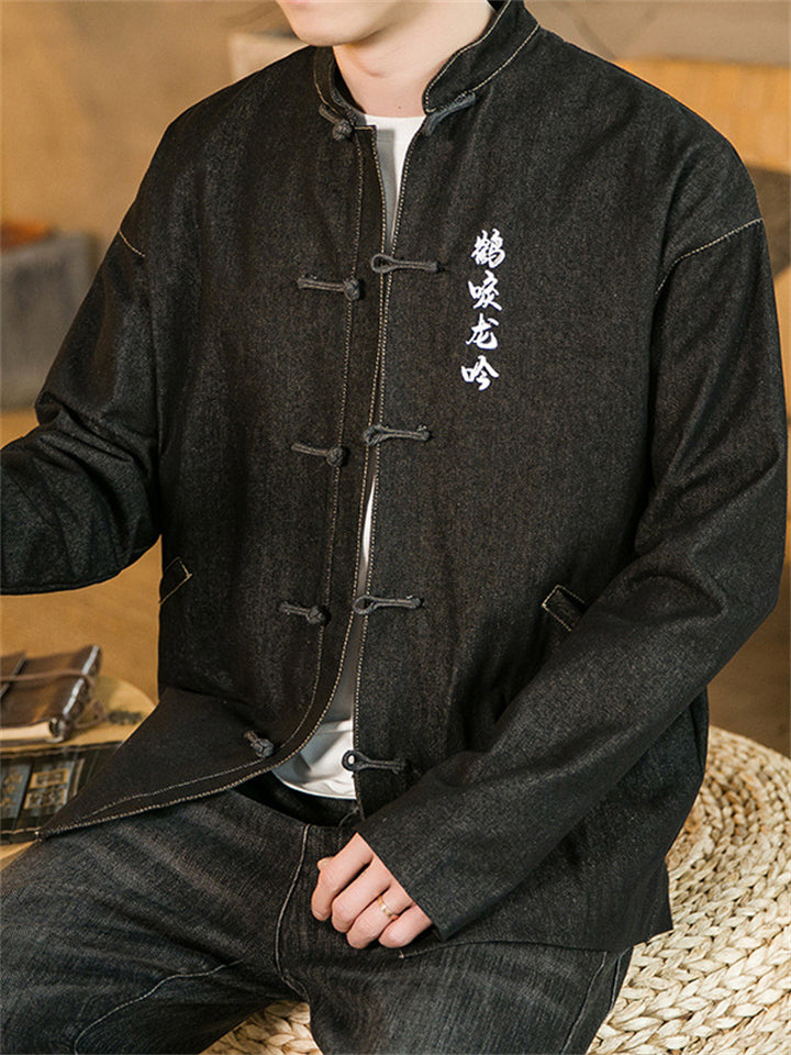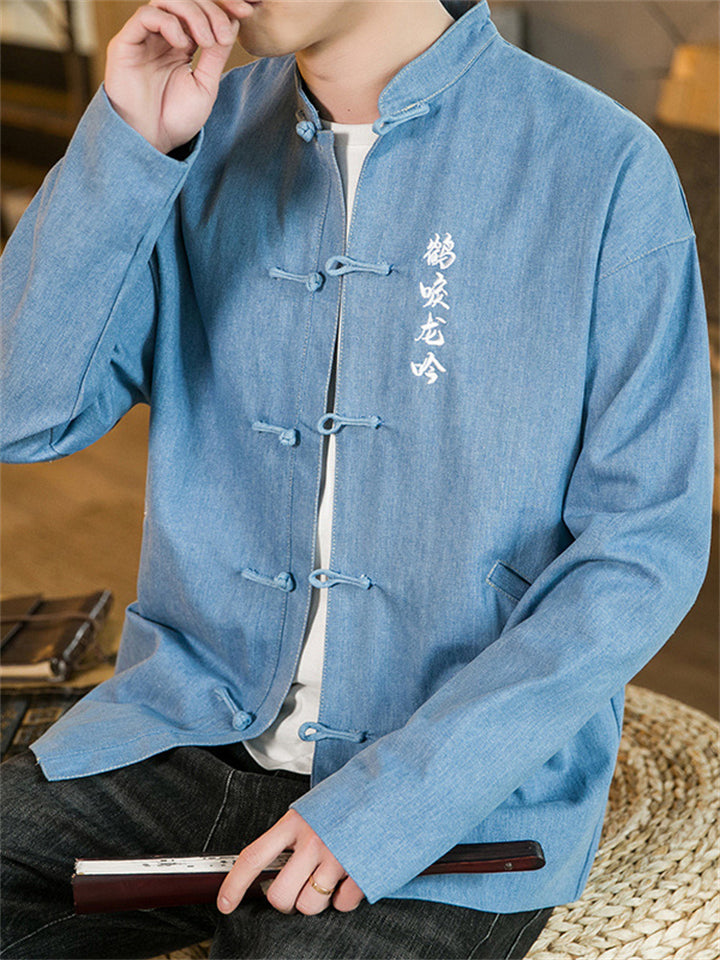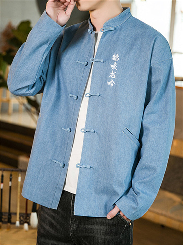 Men's Trendy Stand Collar Knot Button Denim Embroidery Jacket