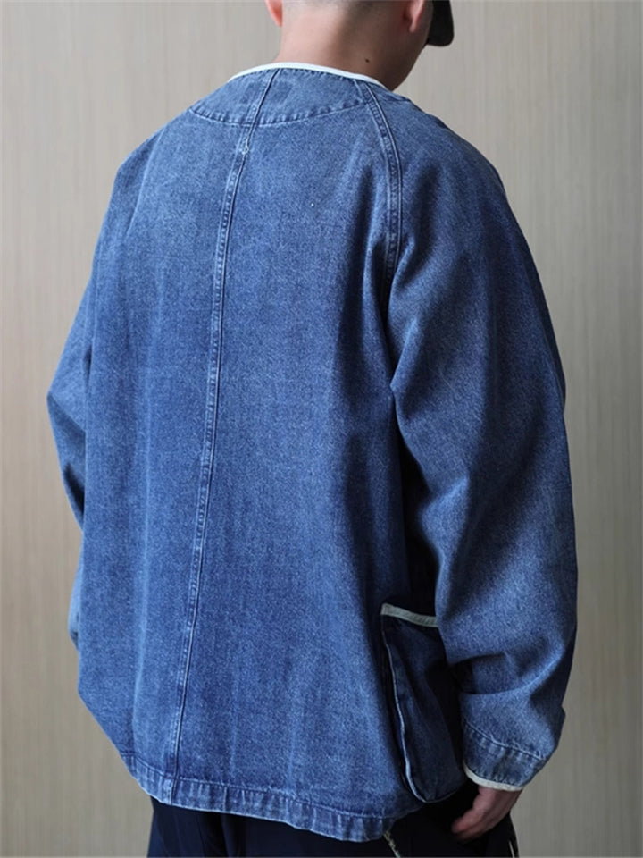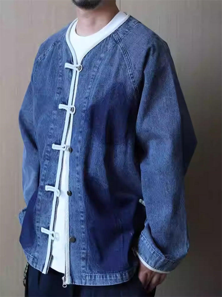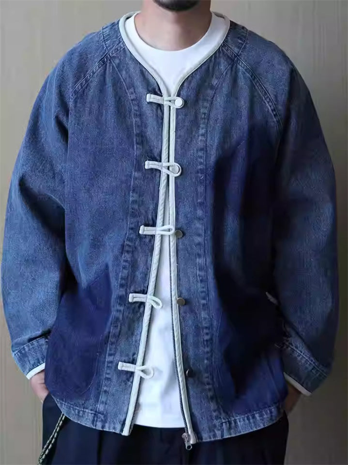 Retro Cotton Collarless Frog Button Denim Jacket for Men