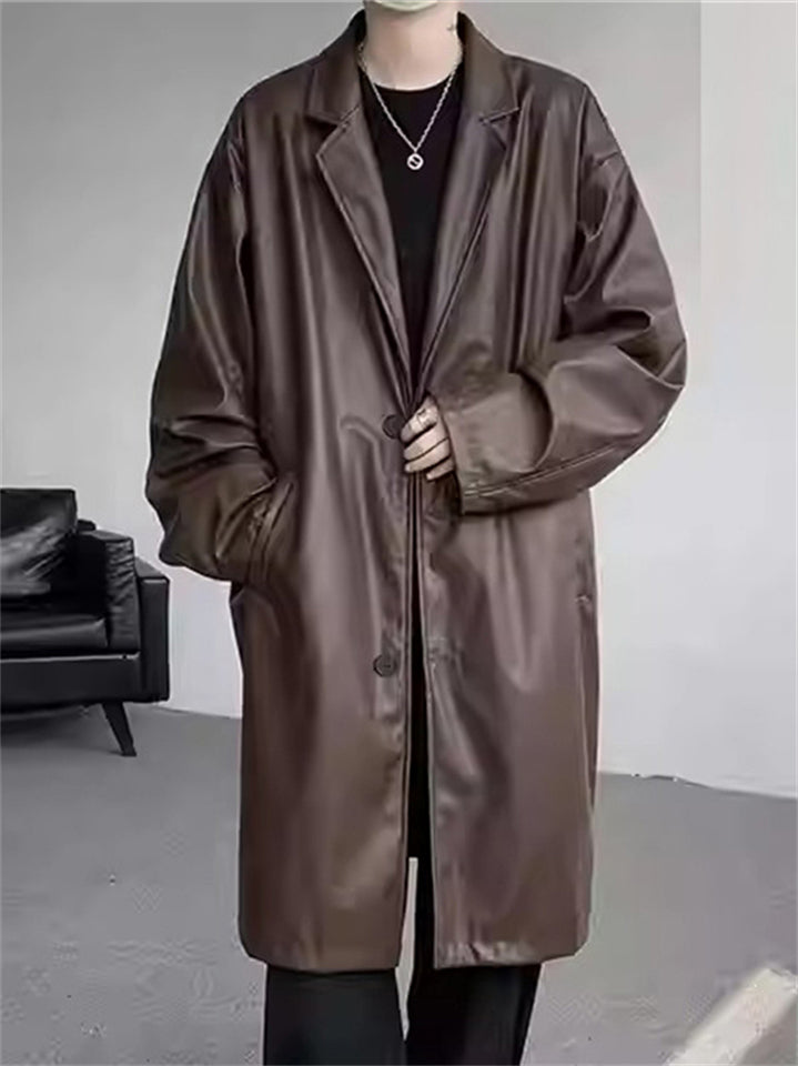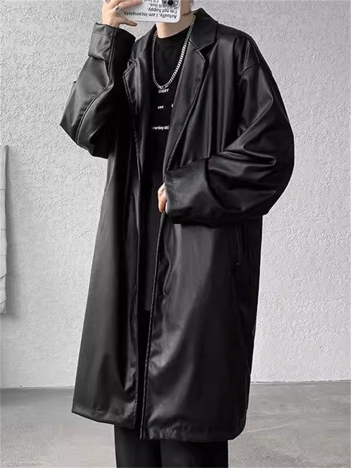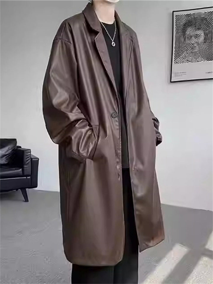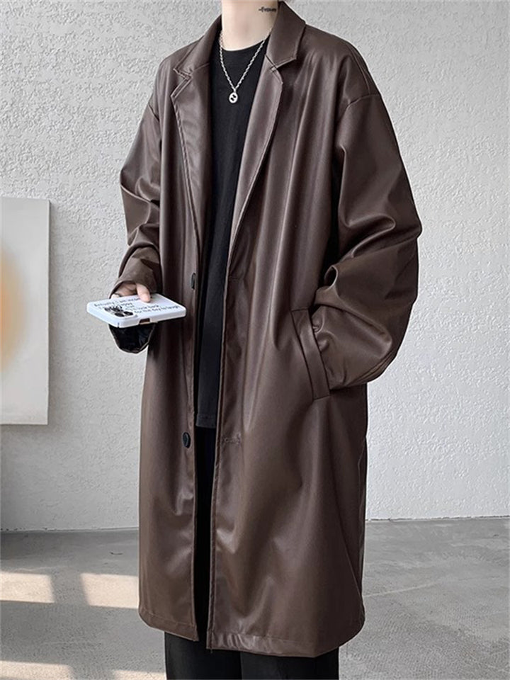 Retro Solid Color Suit Collar Mid Long Trench Jacket for Men