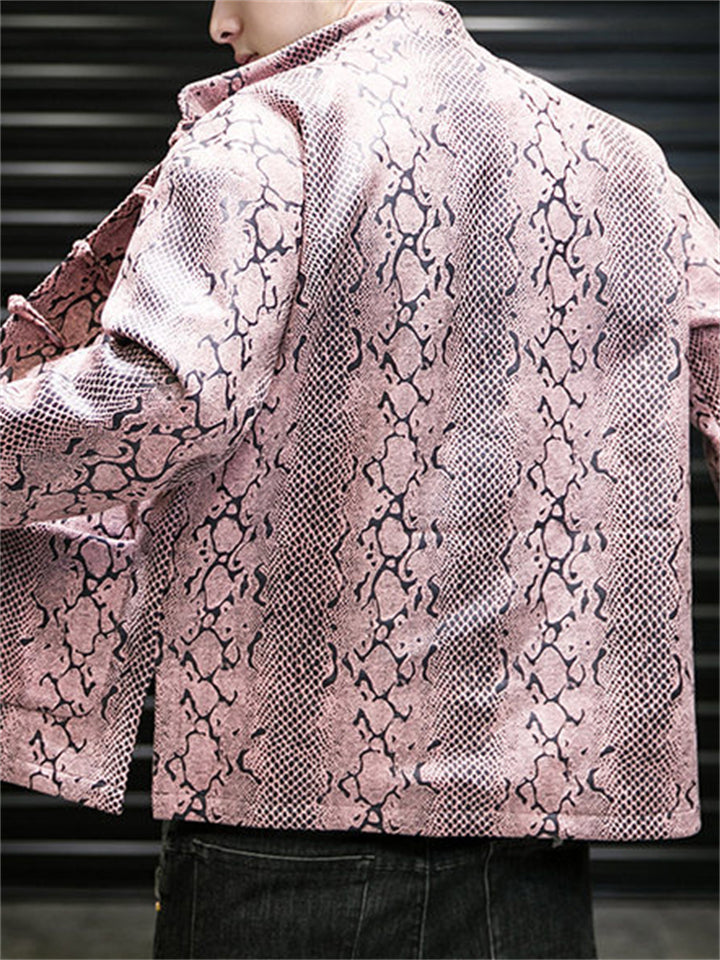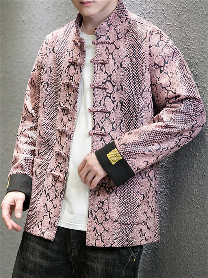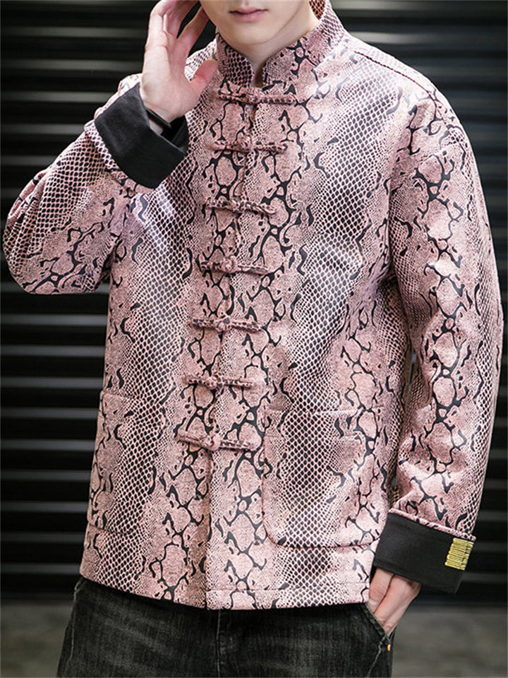 Men's Trendy Chinese Style Loong Printed Frog Button Pink Tangsuit Jacket
