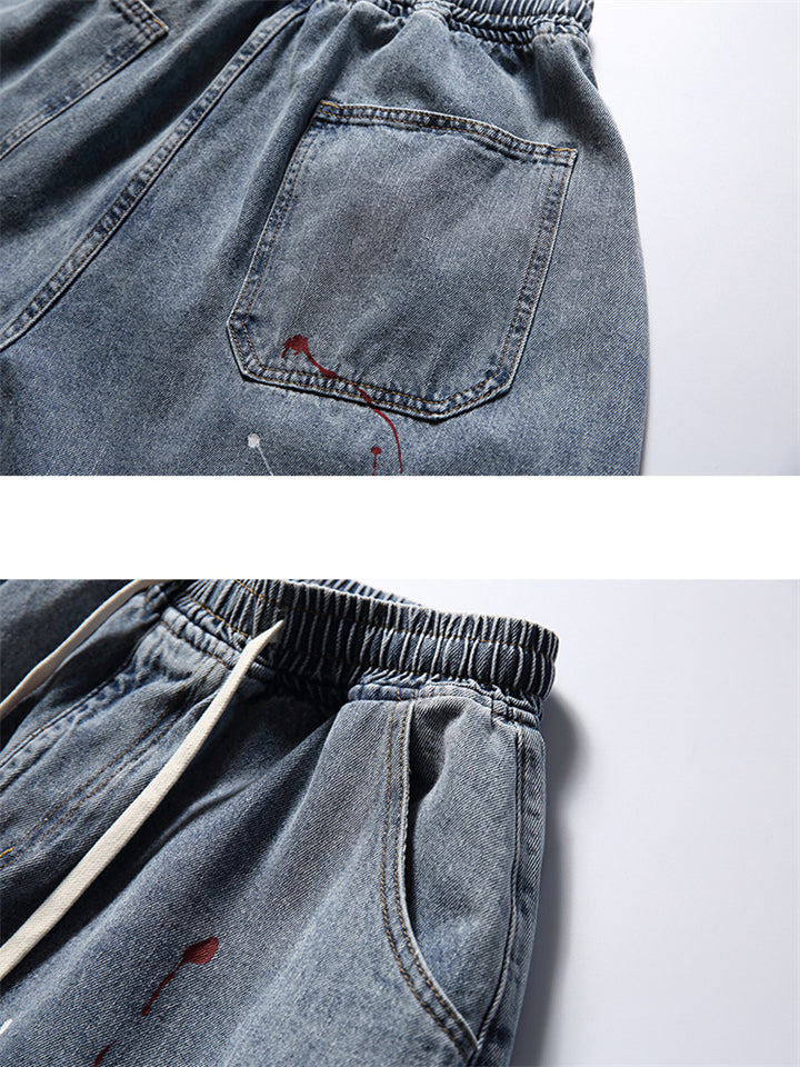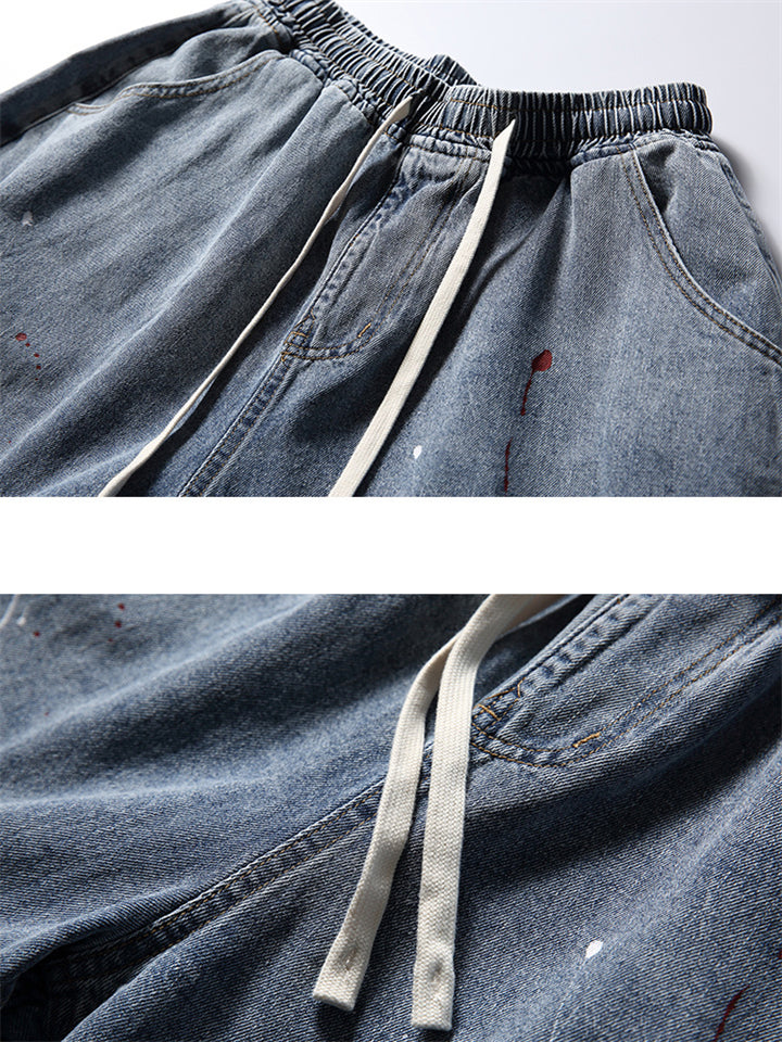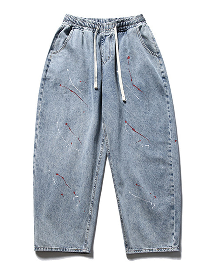 Chic Red White Ink Dot Drawstring Blue Jeans for Men