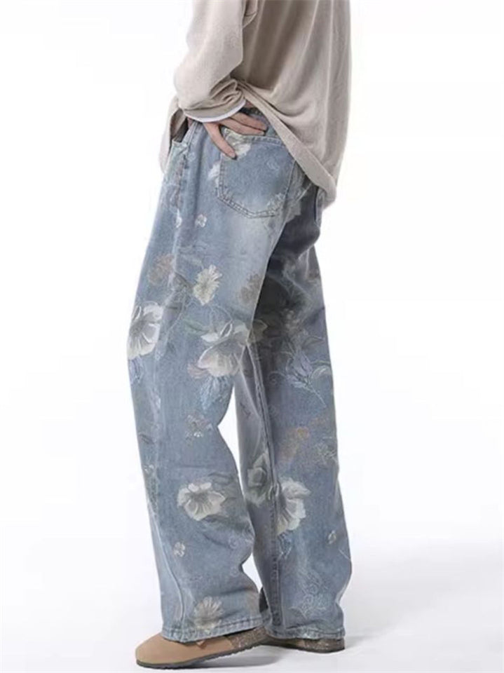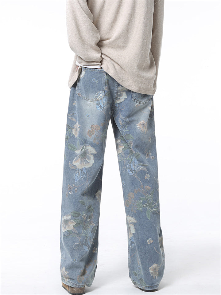 High Street Flowers Print Wide Leg Straight Denim Pants for Men