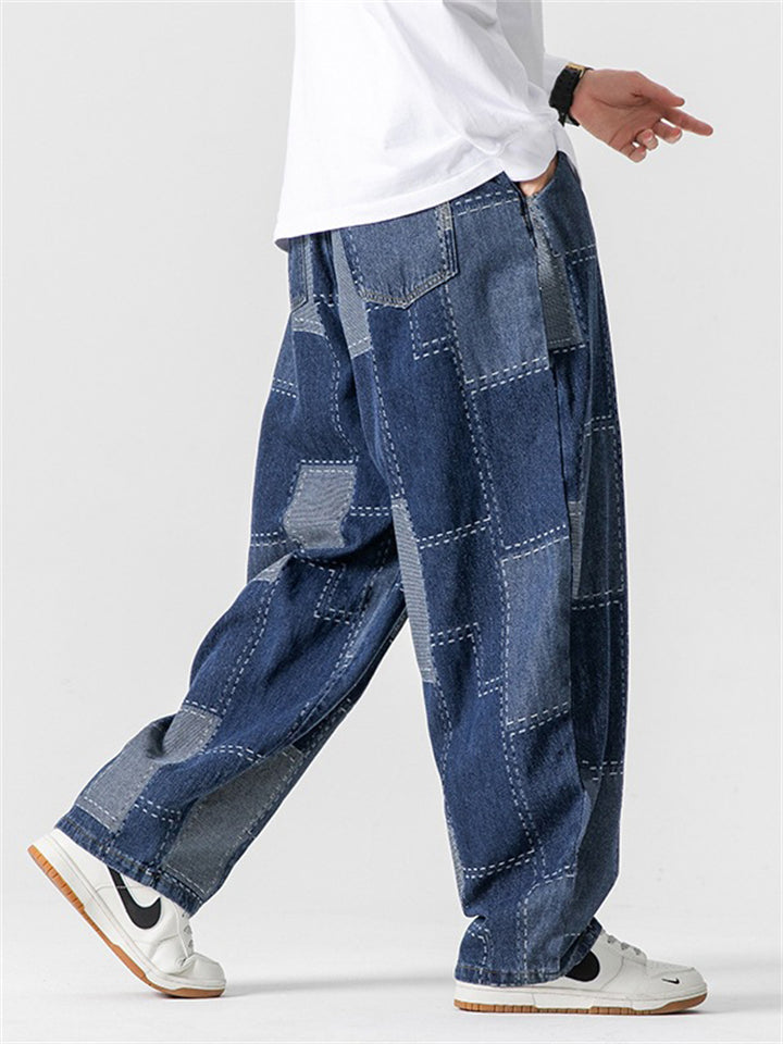 Japanese Style Retro Loose Wide Leg Patchwork Jeans for Men