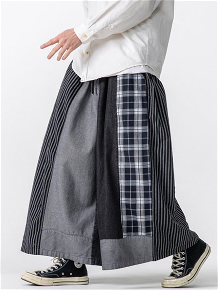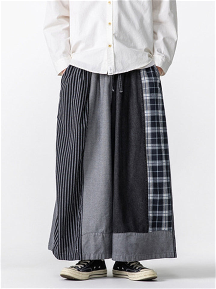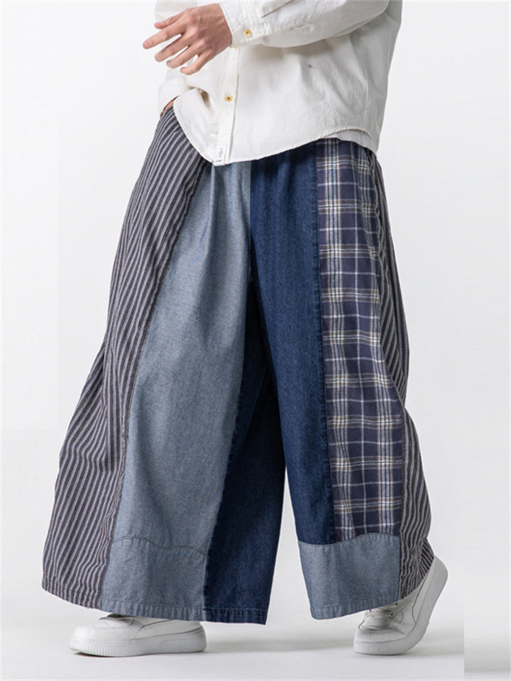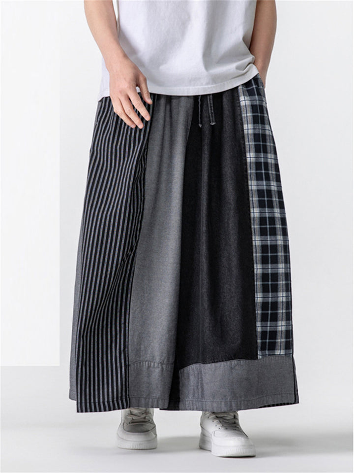 Men's Casual Plaid Stripe Patchwork Wide Leg Cropped Pants