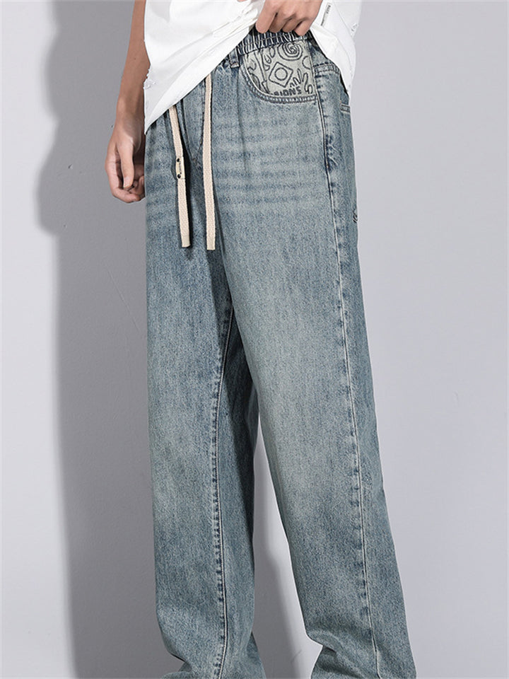 Men's Retro High Street Fashion Elastic Waist Drawstring Wide-Leg Straight Jeans