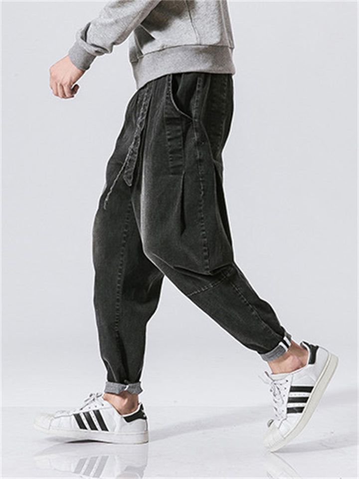Men's Retro Solid Color Drawstring Loose Denim Pants