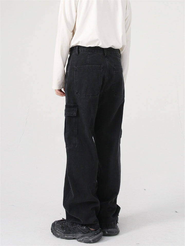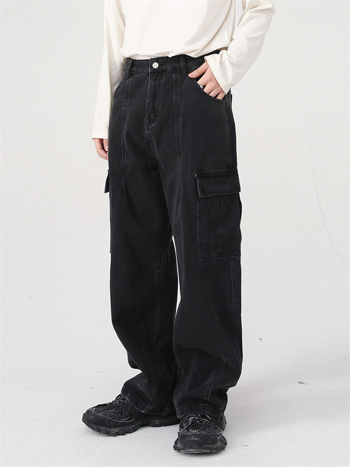 Men's Distressed Solid Color 3D Pockets Wide Leg Straight Jeans