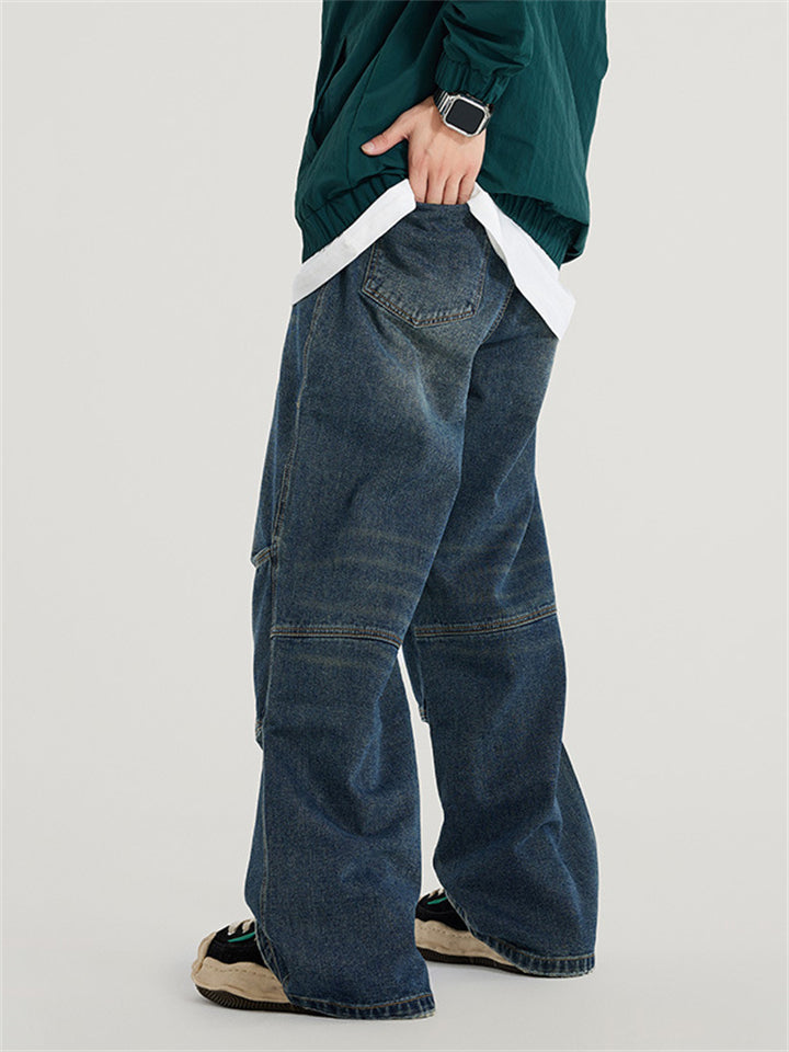 Men's Distressed Solid Color 3D Pockets Wide Leg Straight Jeans