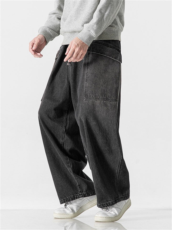 Men's Distressed Solid Color 3D Pockets Wide Leg Straight Jeans