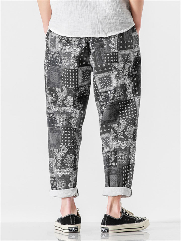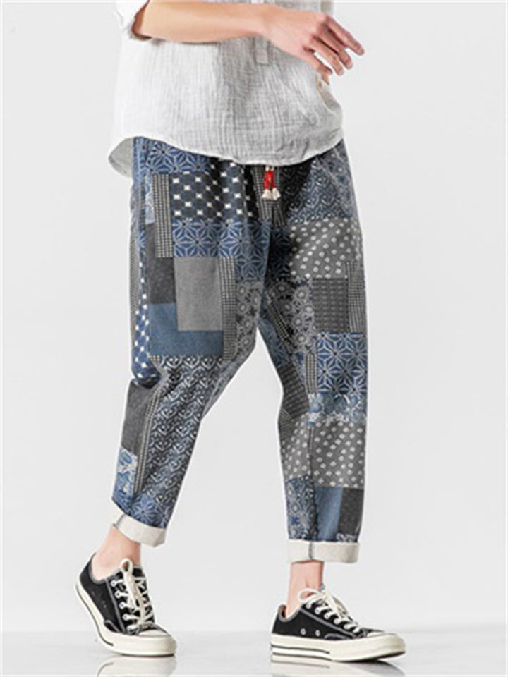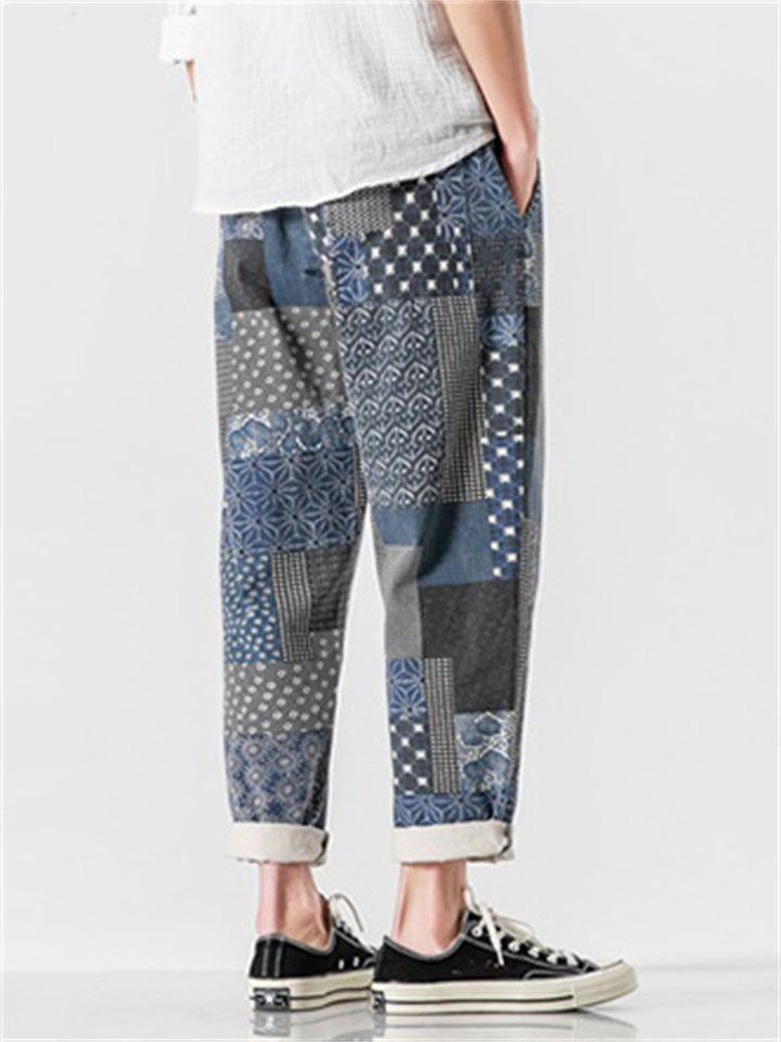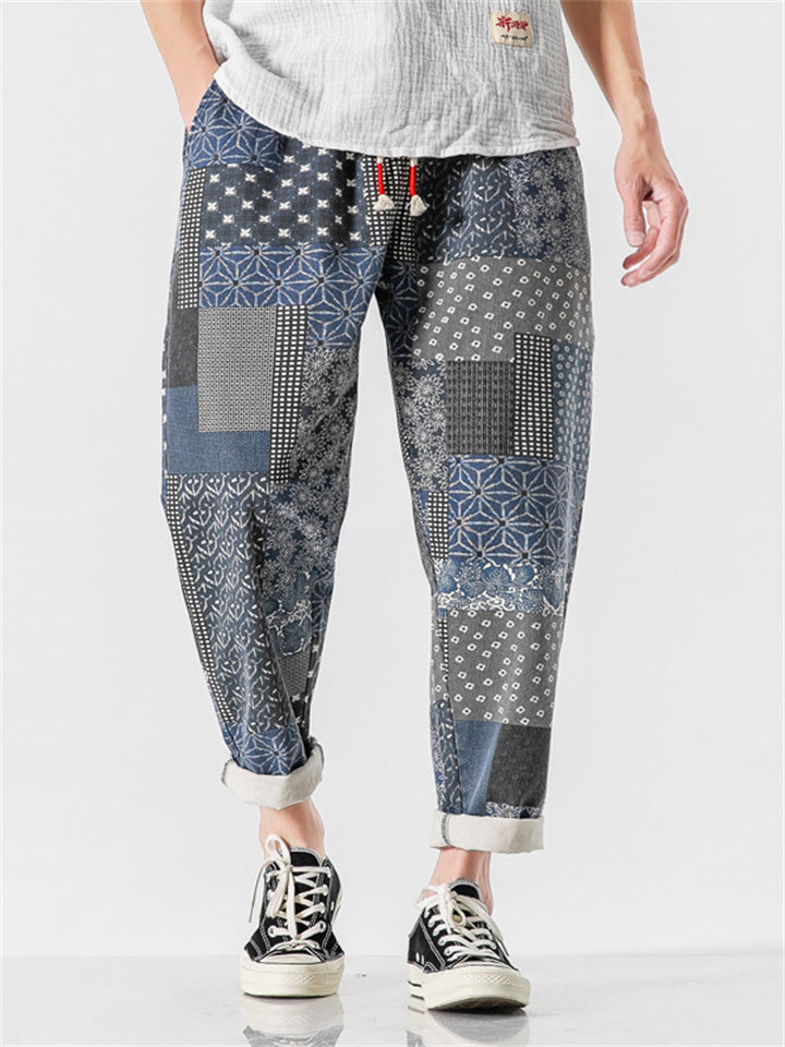 Men's Casual Plaid Stripe Patchwork Wide Leg Cropped Pants