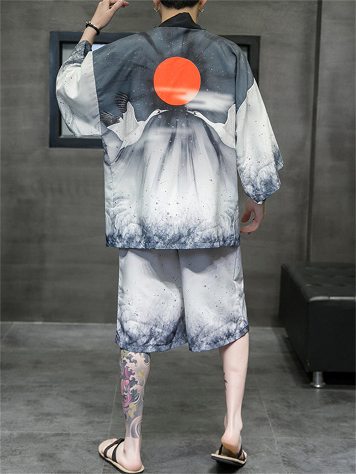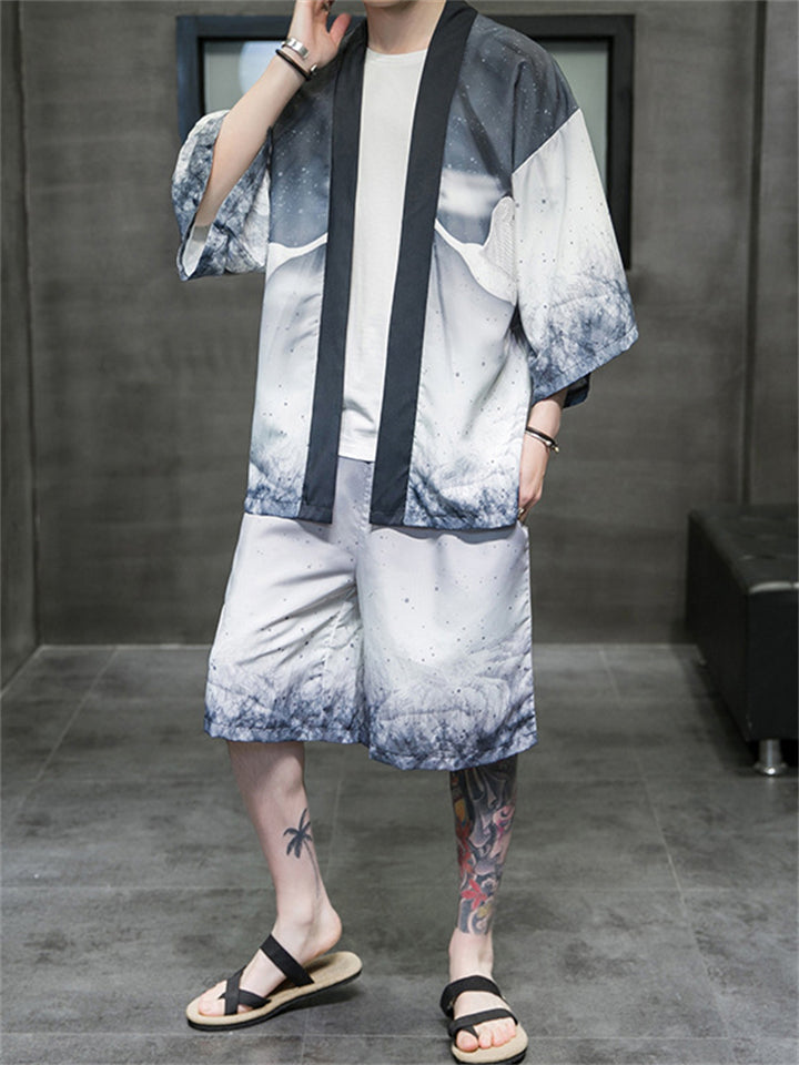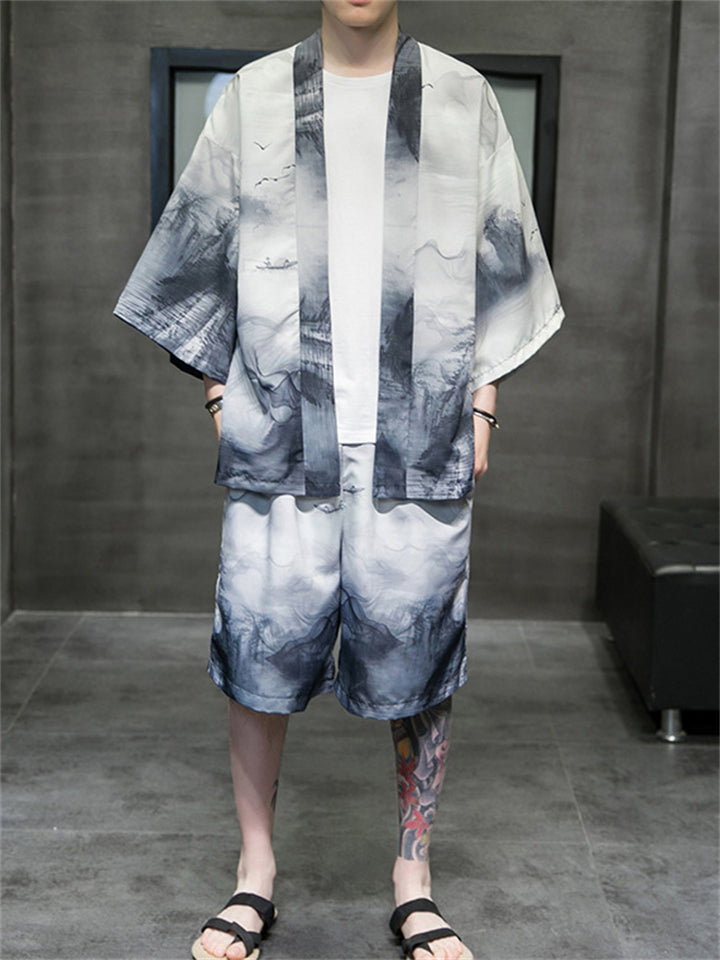 Men's 2Pcs Cool Zen Style Stand Collar Half Sleeve Solid Color Outfits