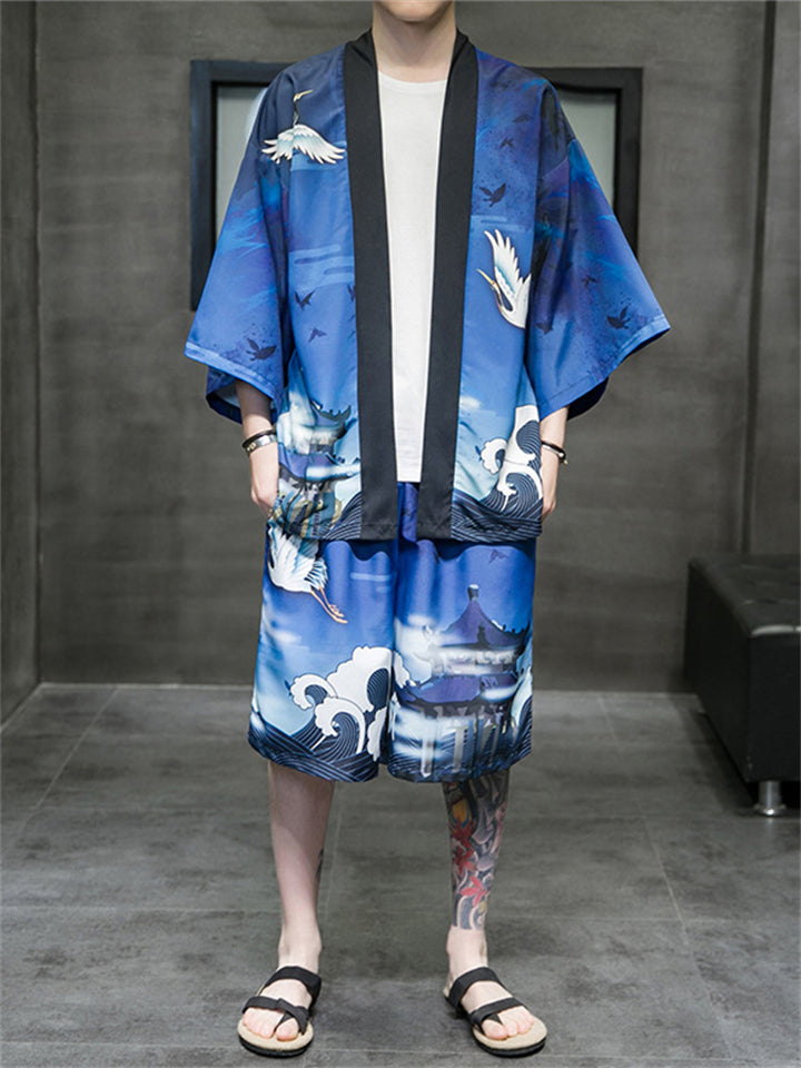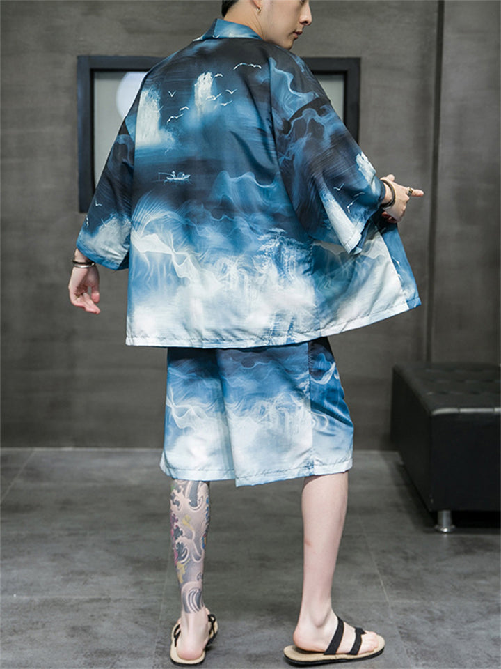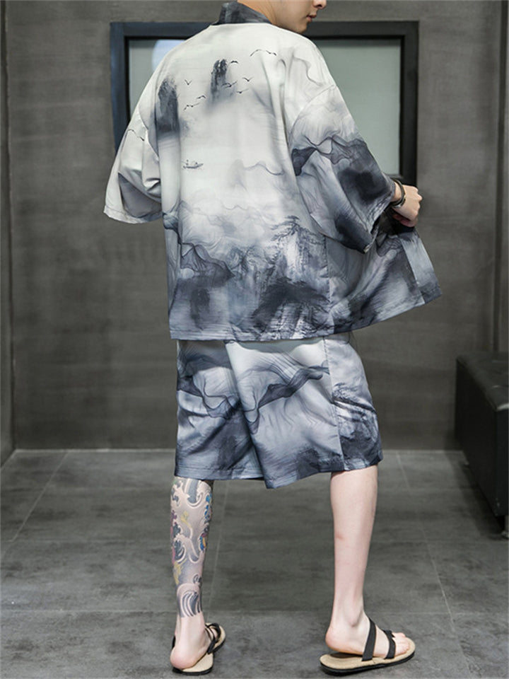 Men's 2Pcs Retro Chinese Style Casual Solid Color 3/4 Sleeve V Neck Outfits