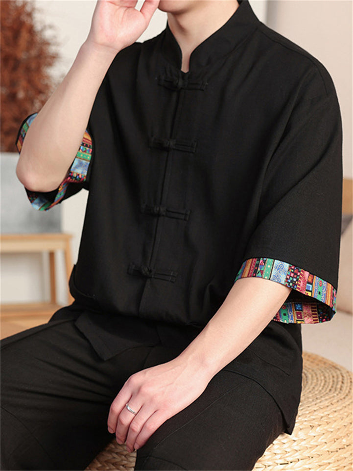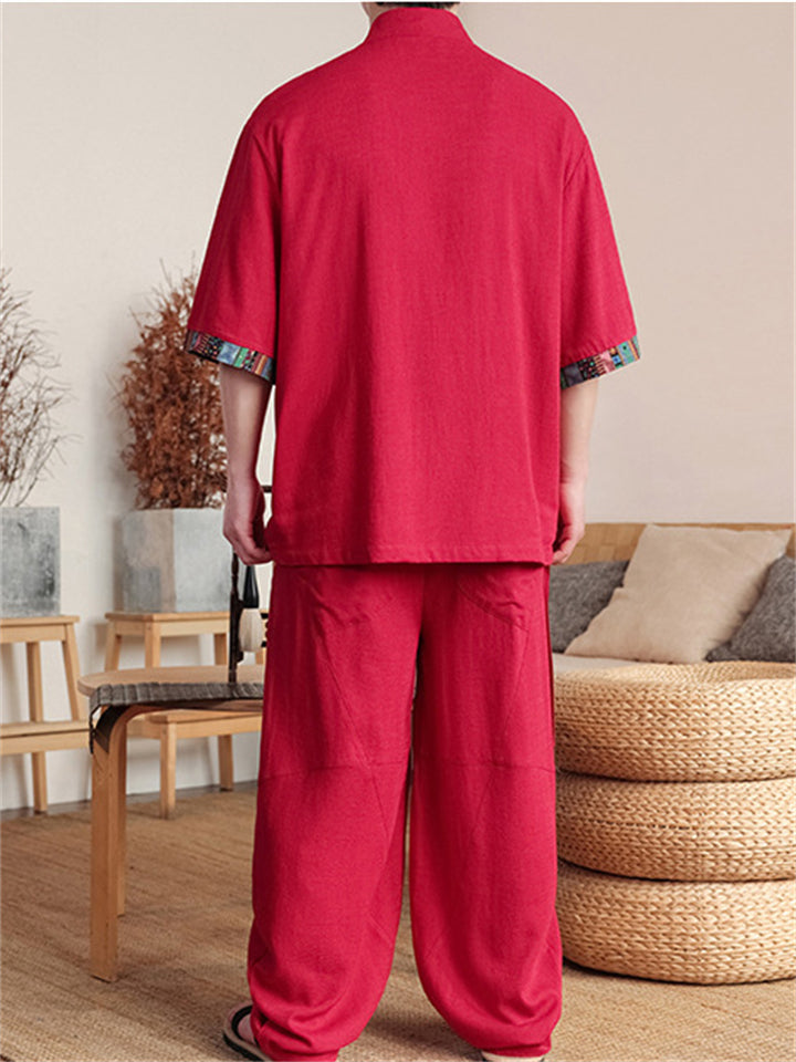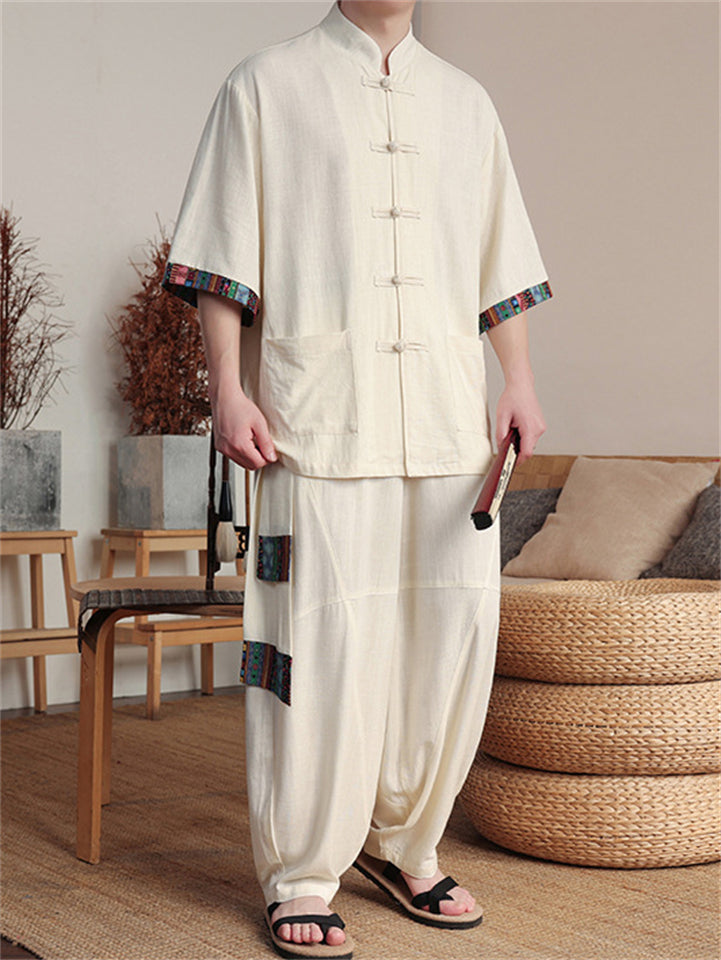 Chinese Ethnic Style Button Linen Tops and Wide Leg Pants Set for Men