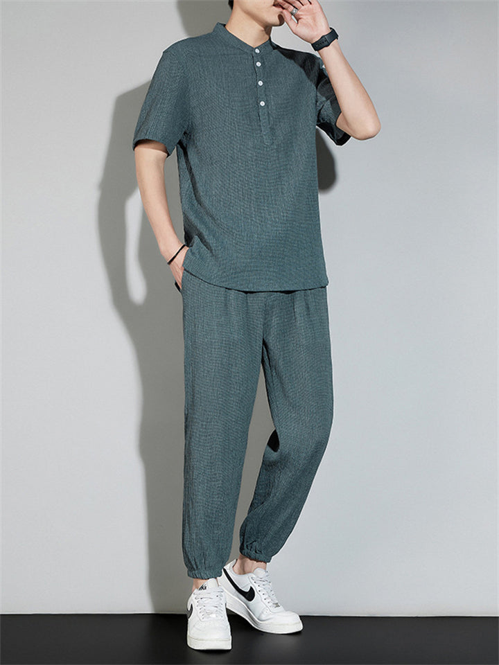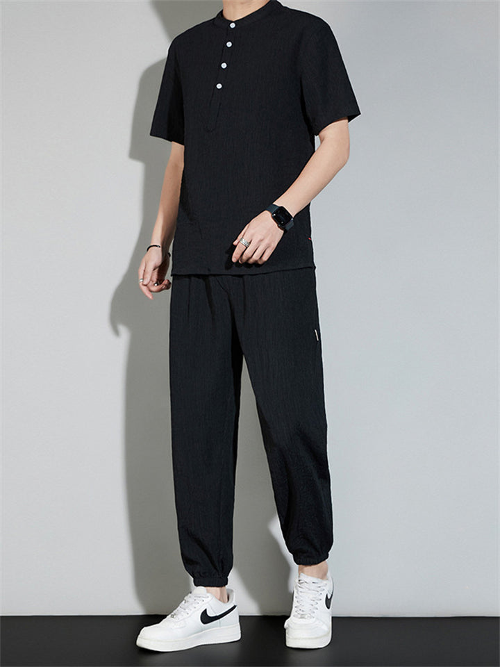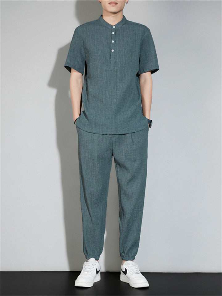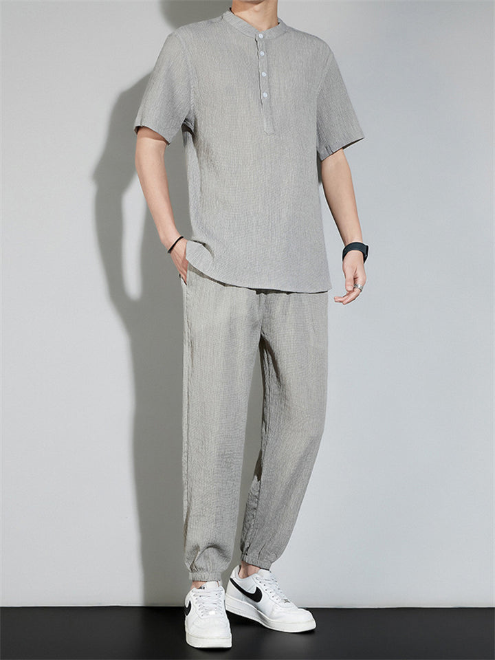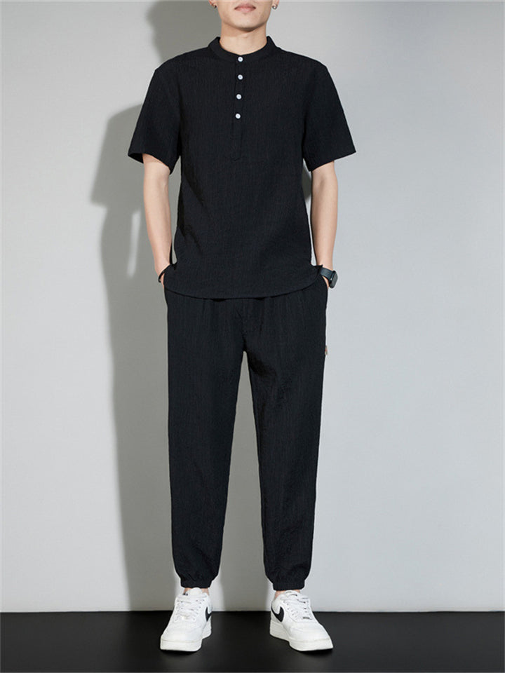 Men's 2Pcs Cool Zen Style Stand Collar Half Sleeve Solid Color Outfits