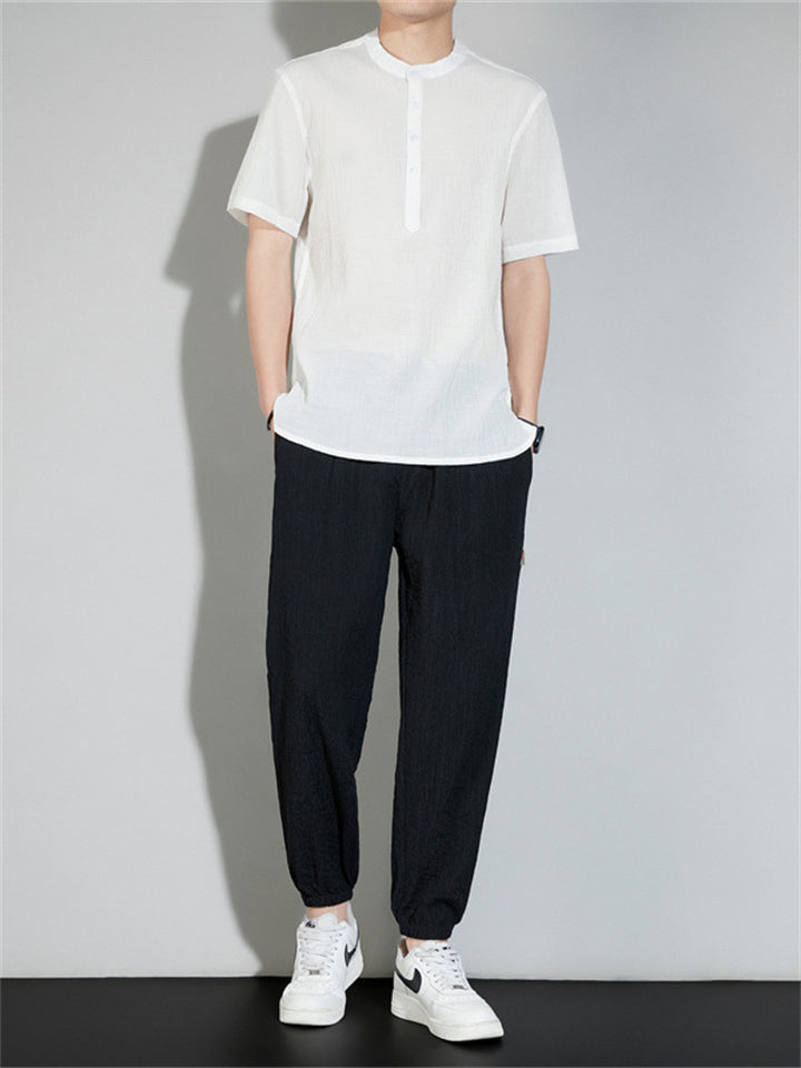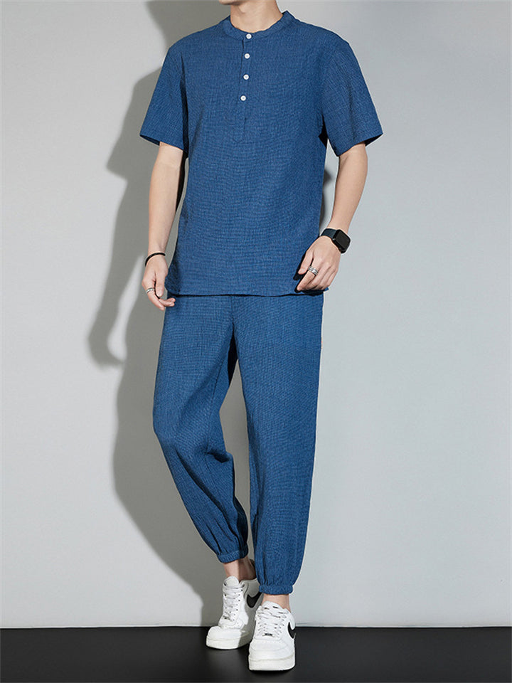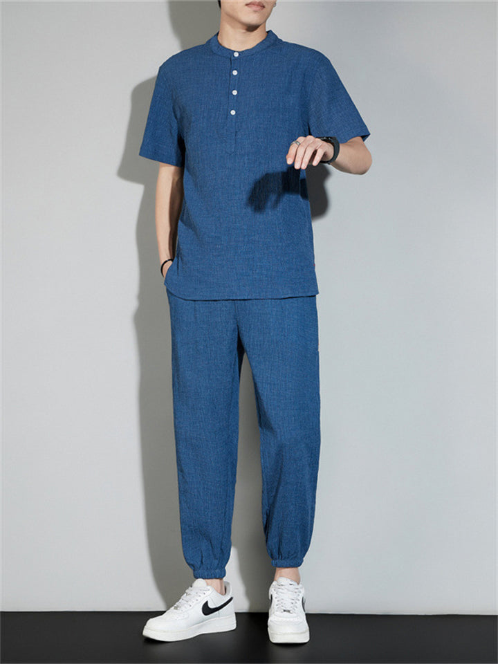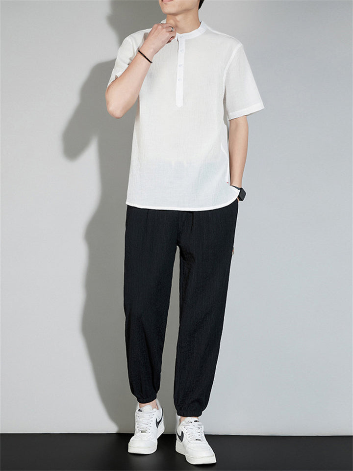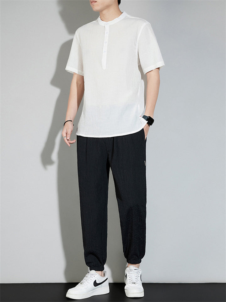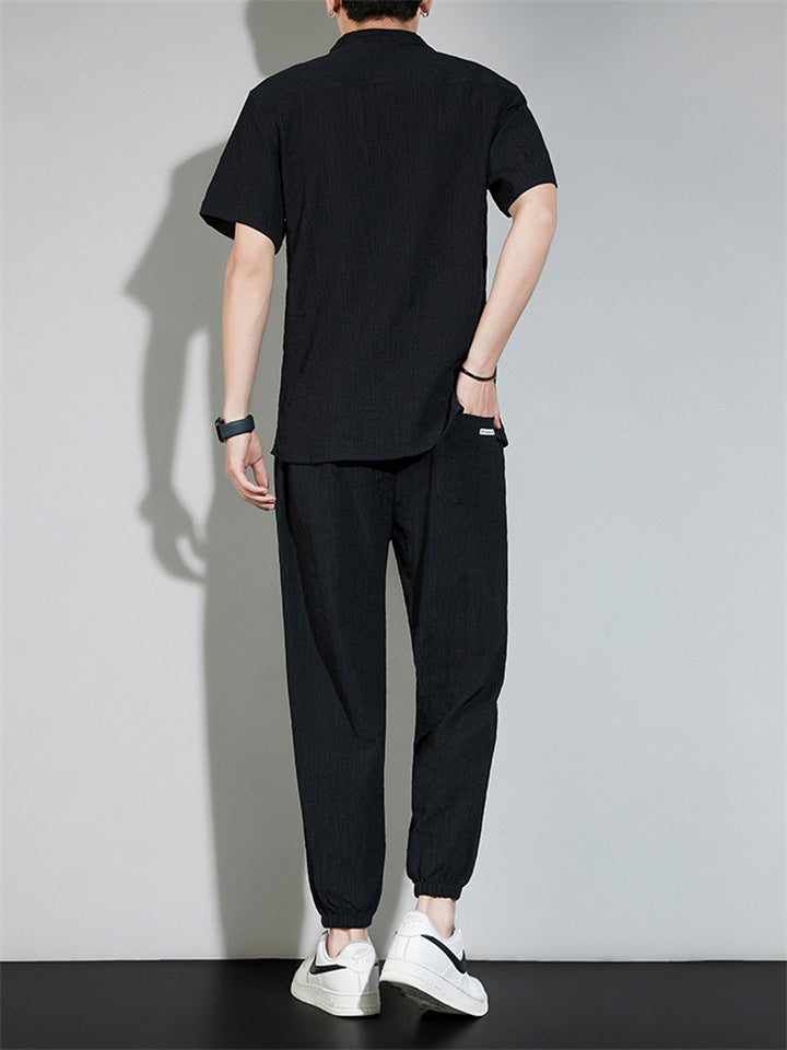 Men's 2Pcs Cool Zen Style Stand Collar Half Sleeve Solid Color Outfits
