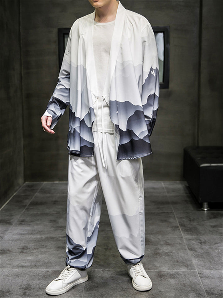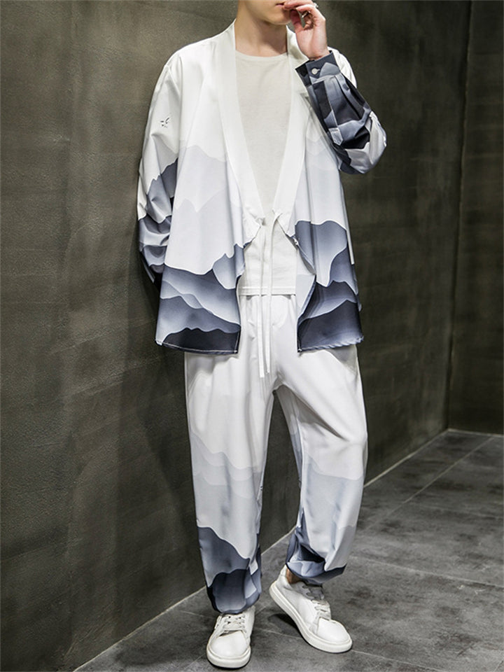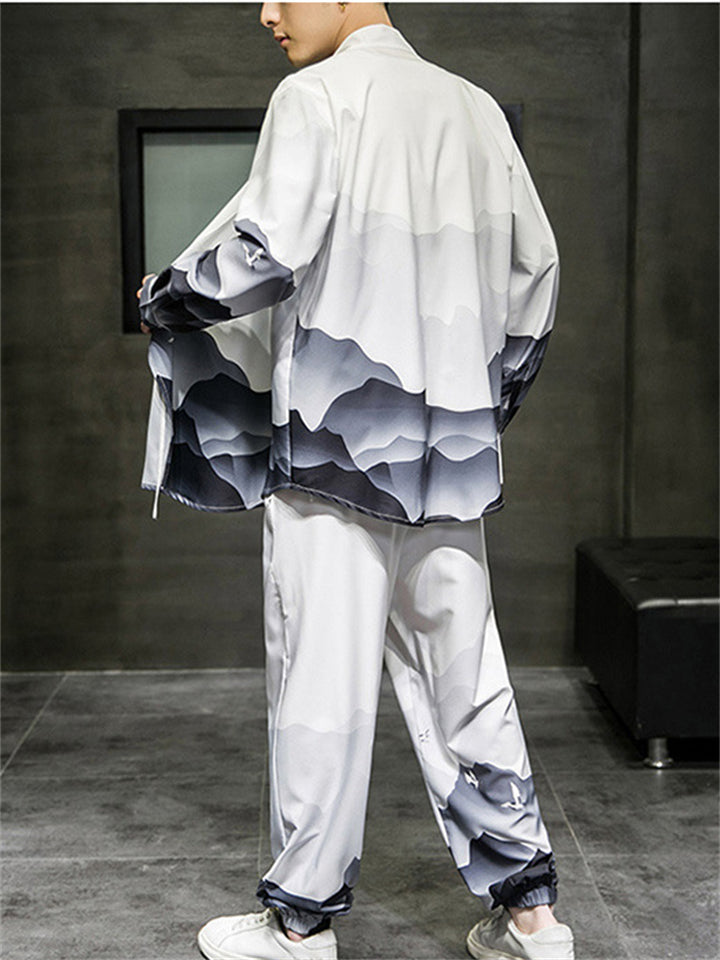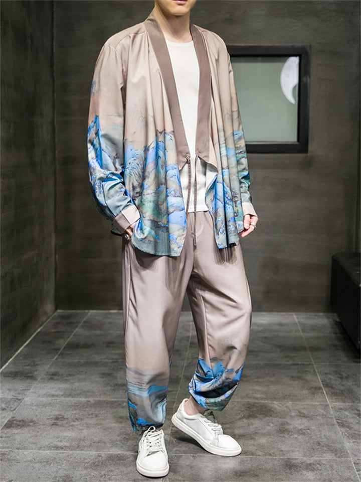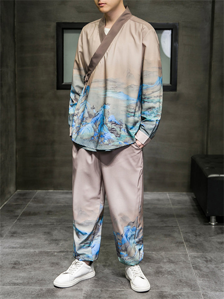 Men's 2Pcs Autumn Chinese Loong Printed Velvet Frog Button Long Sleeve Outfits