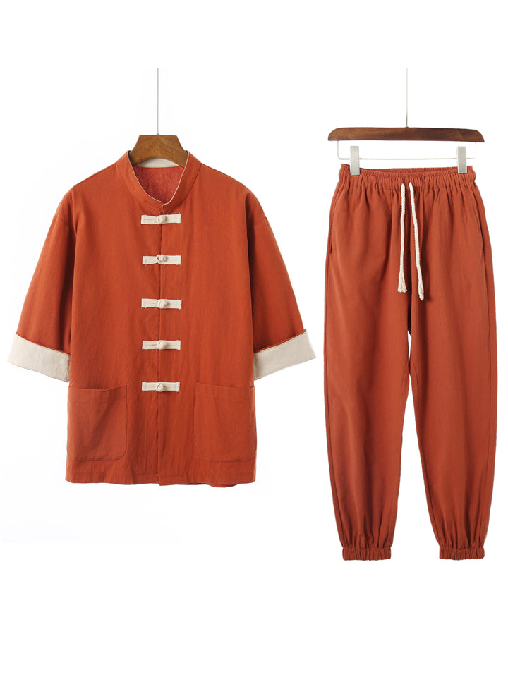 Men's 2Pcs Comfy Autumn Cotton Linen Solid Color TangSuit Outfit