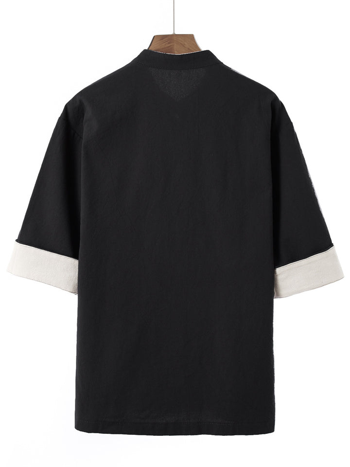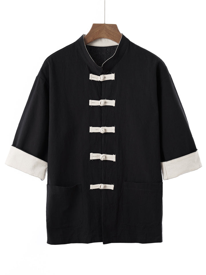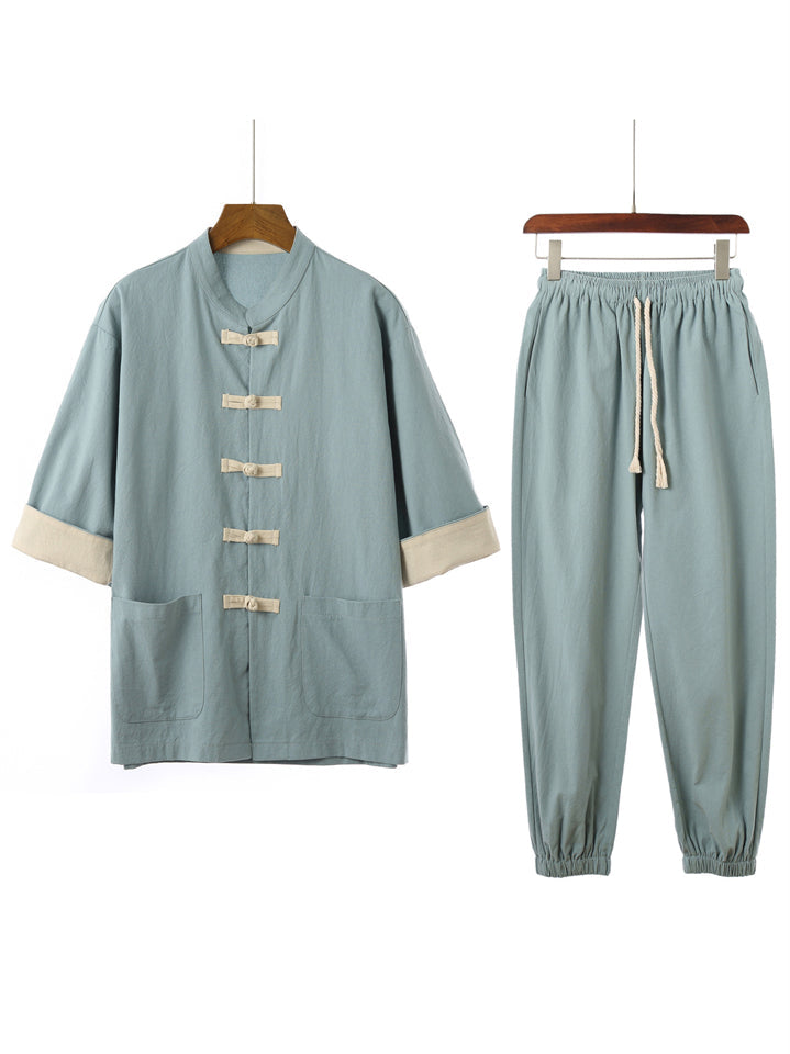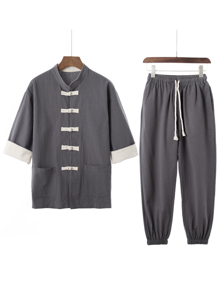 Men's 2Pcs Cool Zen Style Stand Collar Half Sleeve Solid Color Outfits