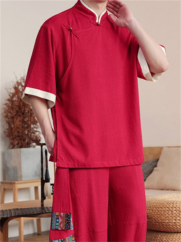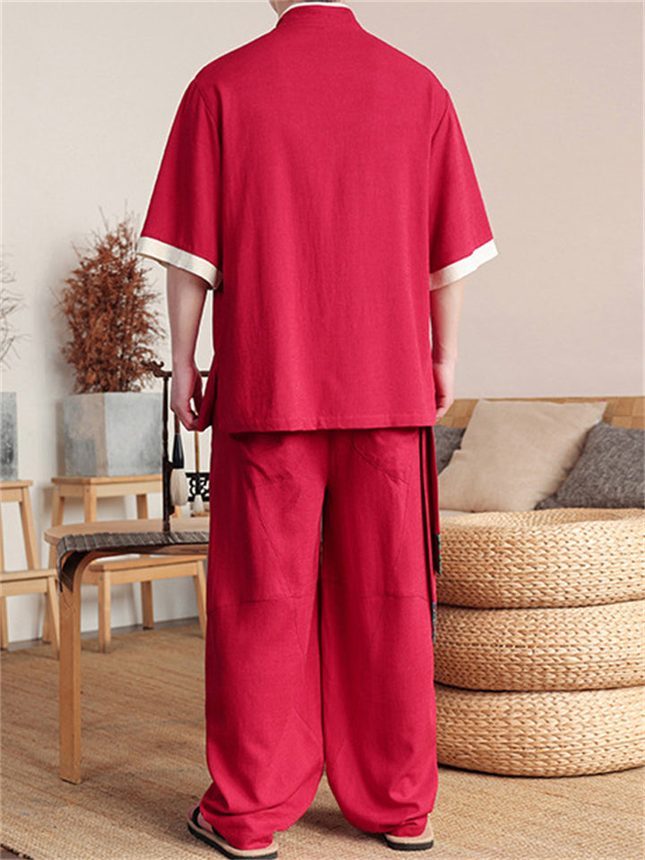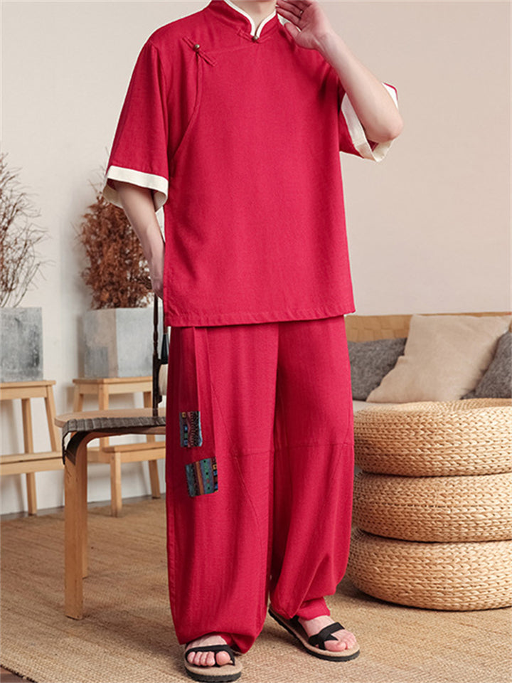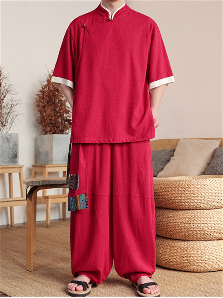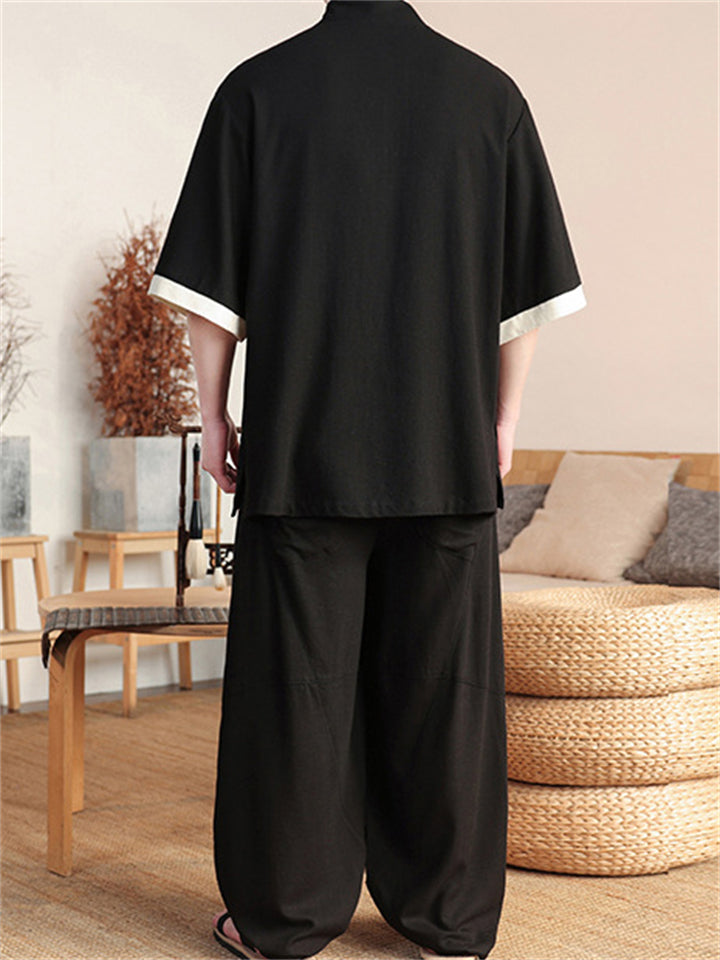 Ethnic Style Slant Opening Plate Buttons Linen Tops and Wide Leg Pants Set for Men