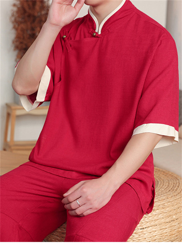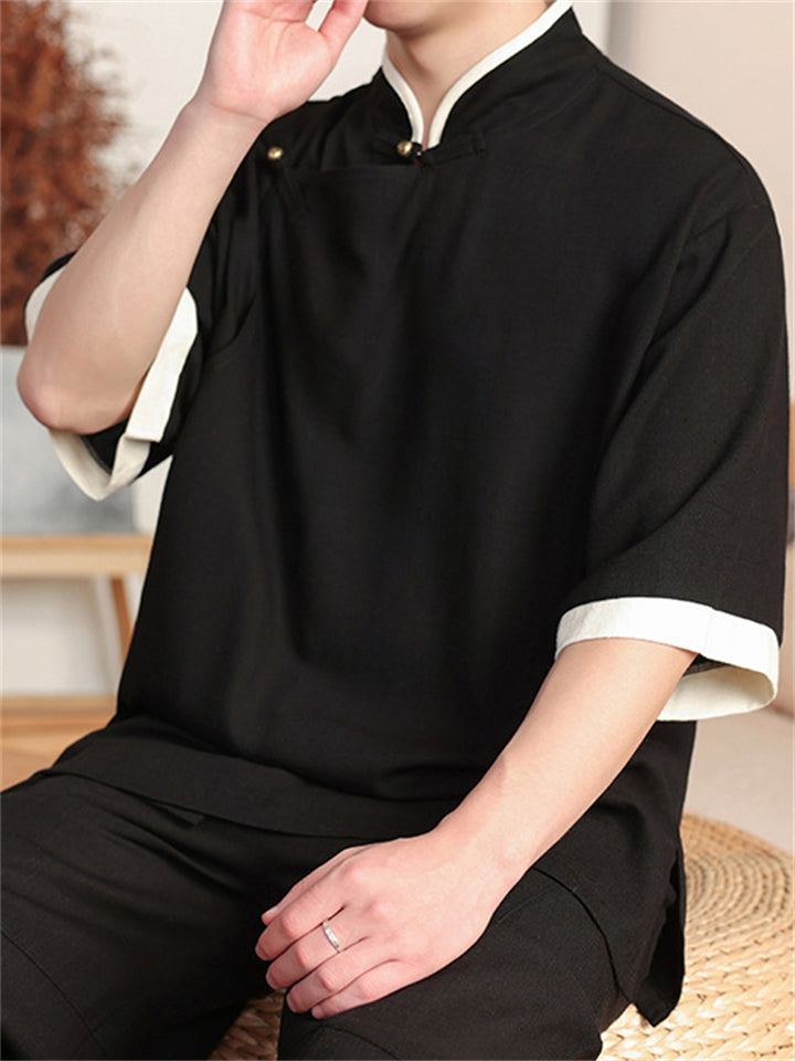 Men's 2Pcs Cool Zen Style Stand Collar Half Sleeve Solid Color Outfits